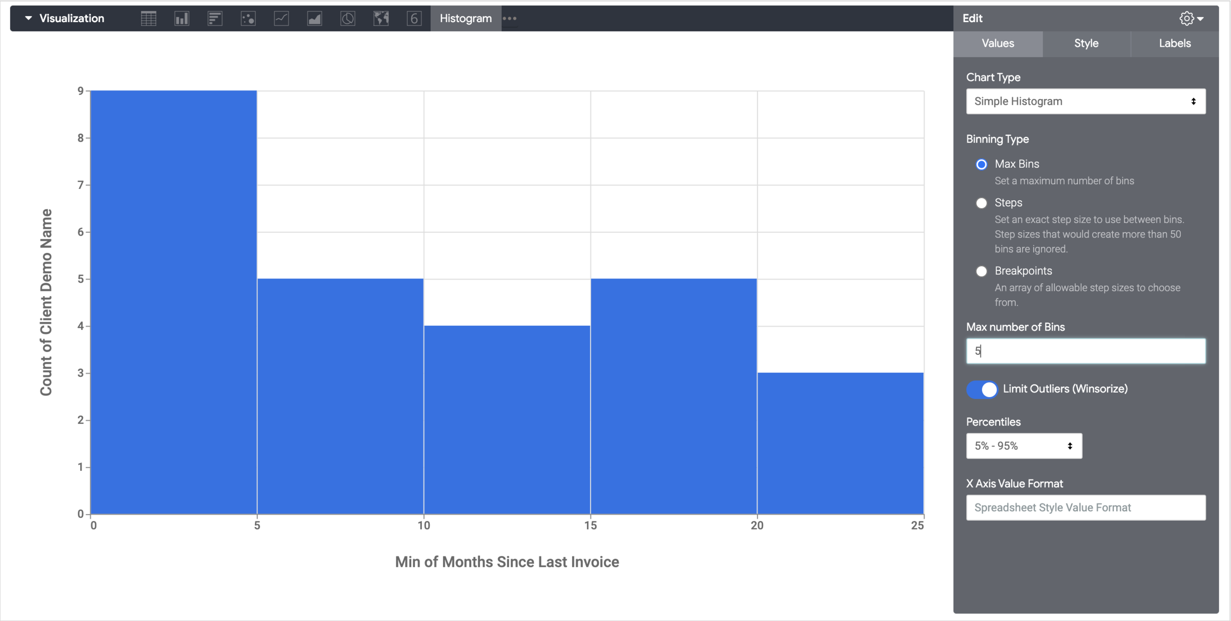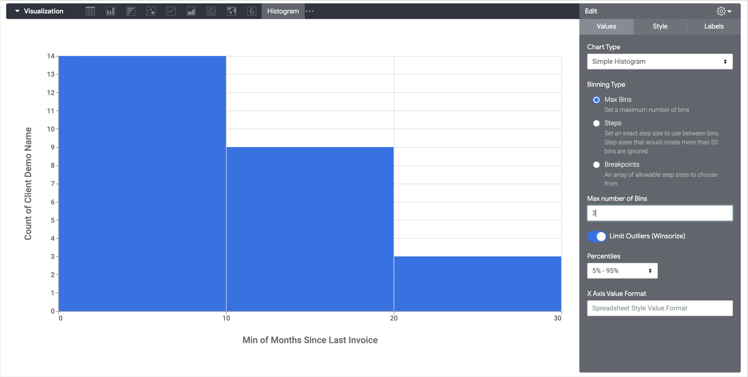 Using this visualization we entered a range of values and settings for the different bucket bin definitions, starting with the default 3 bins for the minimum months since last invoice measure used for the recency score.