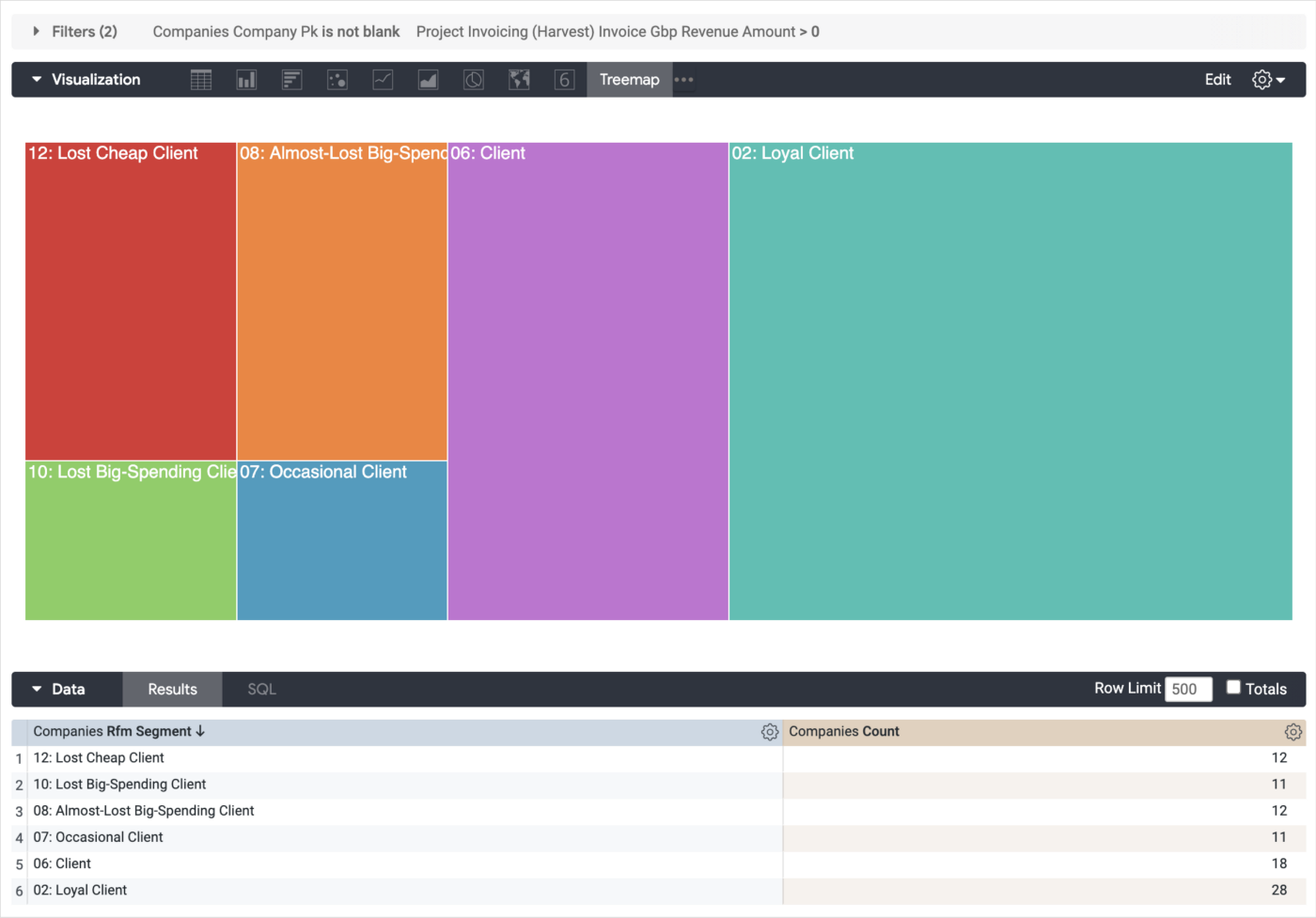 We also used the Treemap visualization that you can manually install into your Looker instance from Looker’s Custom Visualizations v2 Github repo and configured it to use the RFM segment cell name along with the count of clients in those segments as the measure.