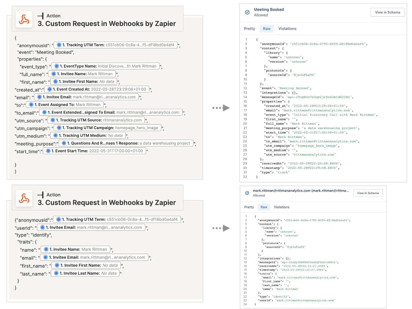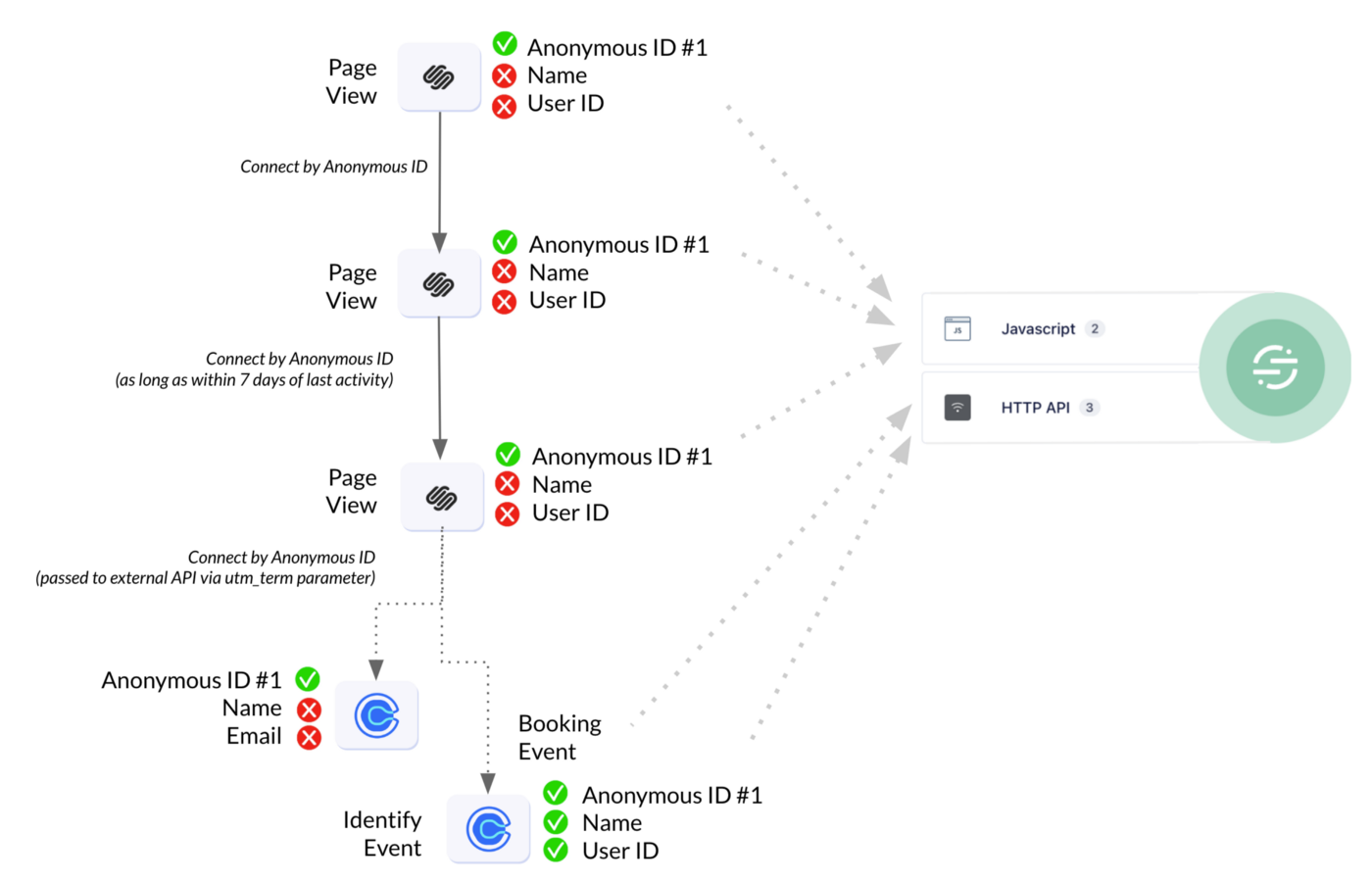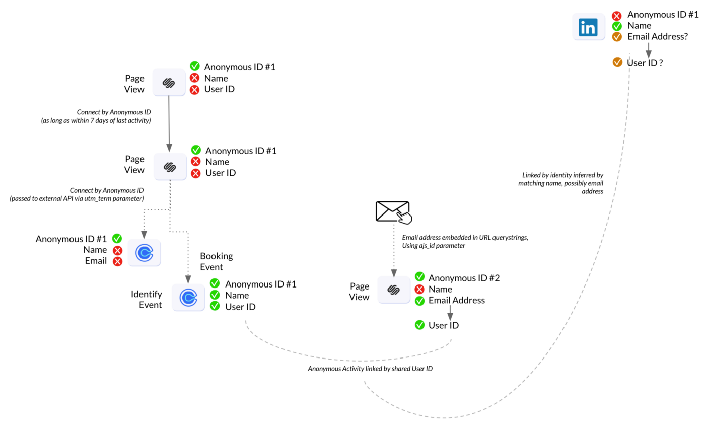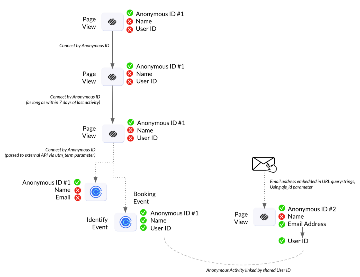 Then, if the visitor returns at a later date with a different AnonymousId and books a second meeting using the same email address, both sets of events and anonymousIds in the downstream warehouse can be linked via their common UserId.