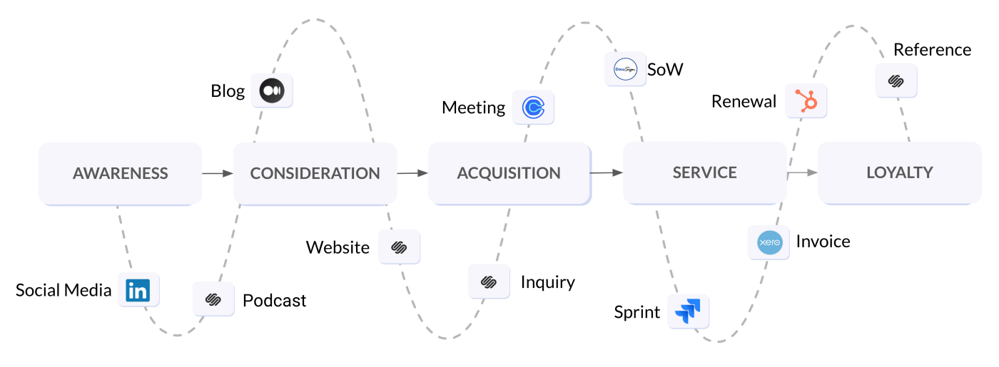 By centralizing all of this client activity in a cloud data warehouse one of the most valuable use-cases we have for this data is to help us understand our customer journey, from initial awareness through to service and (if all goes well) loyalty.