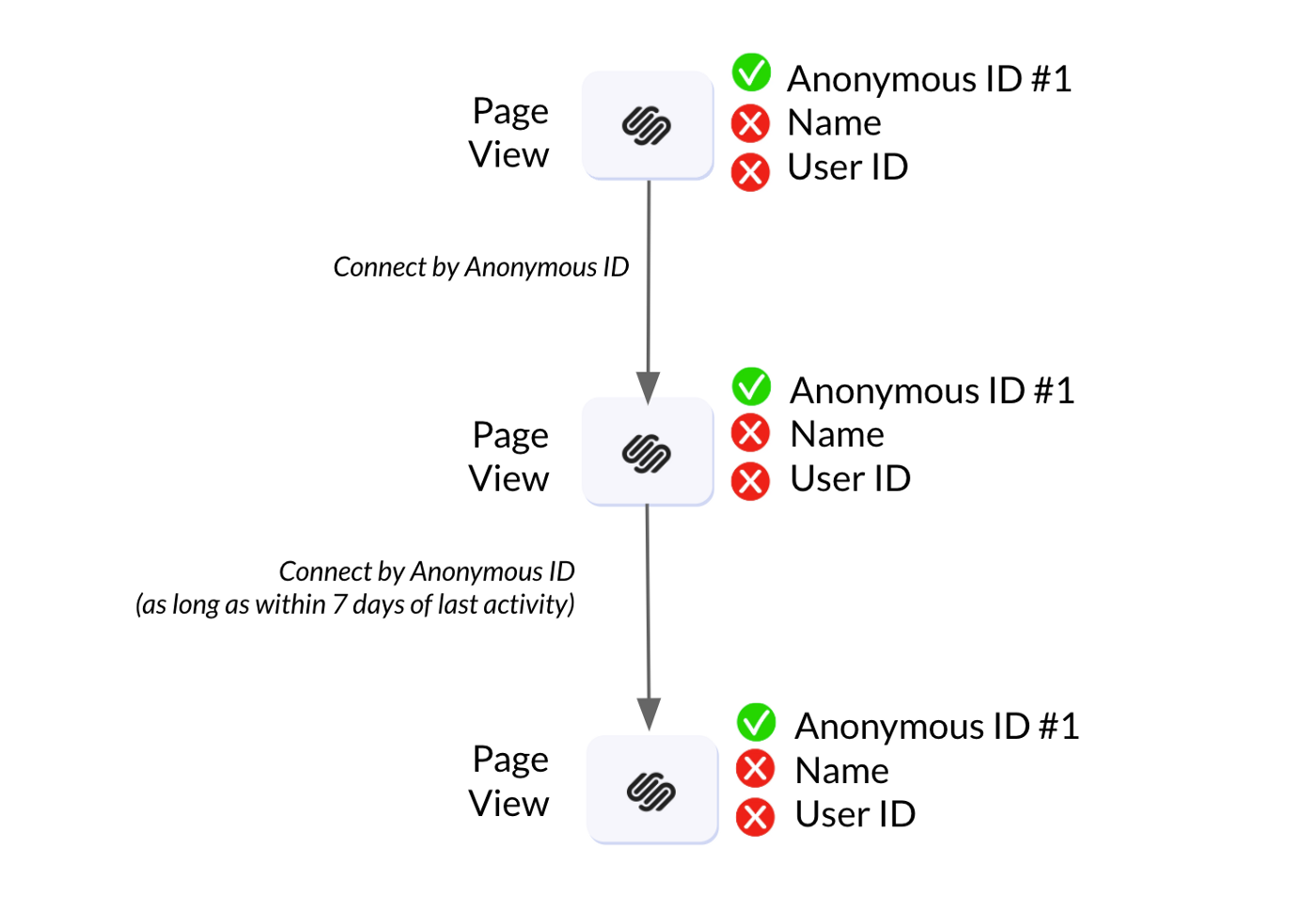 Starting with the simplest example of a visitor arriving at our website and browsing a series of pages, all of that activity would be anonymous but connected via their anonymousId, a randomly generated 36 character string automatically assigned to the user’s browser or device on first visit.