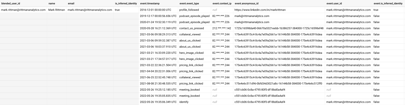 See how the for the first anonymousId the IP address is constant, whereas for the second their IP address has changed over time; in addition, both of these anonymousIds may in-fact be linked to the same person, you just wouldn’t know it from the data as its currently shown.