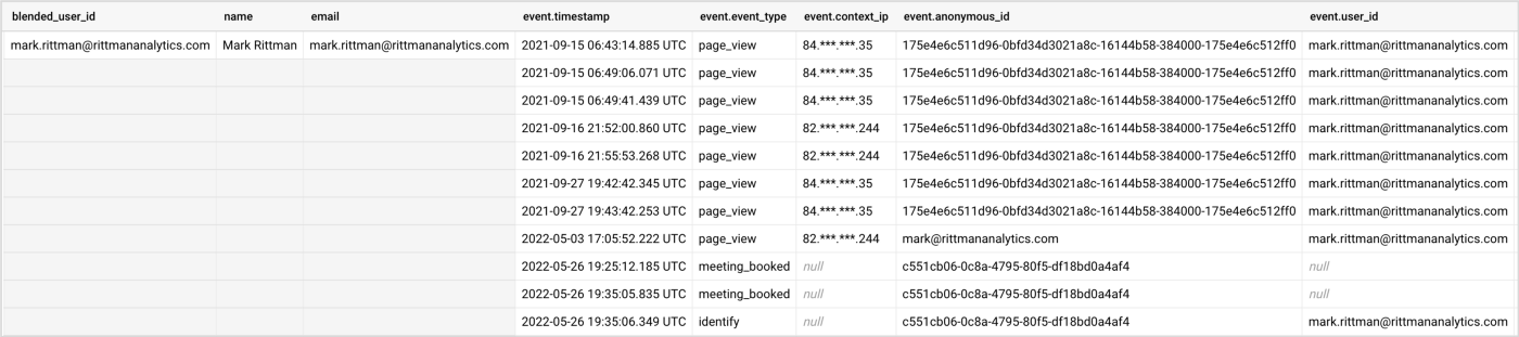 ...id_stitching as (selectdistinct anonymous_id as anonymous_id,last_value(user_id ignore nulls) over (partition by anonymous_id order by timestamp rows between unbounded preceding and unbounded following ) as user_id,min(timestamp) over (partition by anonymous_id ) as first_seen_at,max(timestamp) over (partition by anonymous_id ) as last_seen_atfromevents ),mapped as (selectcoalesce(i.user_id,e.anonymous_id) as blended_user_id,e.*fromevents eleft joinid_stitching iusing(anonymous_id)),names_backfilled as (select* except (name,email),last_value(email ignore nulls) over (partition by blended_user_id order by timestamp rows between unbounded preceding and unbounded following ) as email,last_value(name ignore nulls) over (partition by blended_user_id order by timestamp rows between unbounded preceding and unbounded following ) as namefrommapped ),...