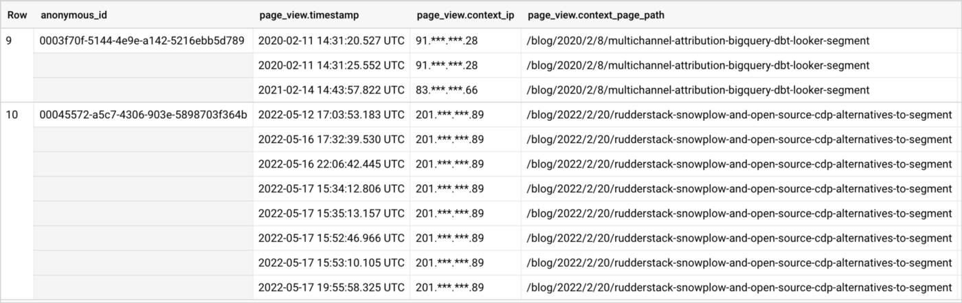 We can see this in our Segment event data stored in our Google BigQuery data warehouse by querying it and then grouping by anonymousId (note that the SQL expression around the context_ip column was added to obfuscate IP addresses in the example output here and later in this blog)