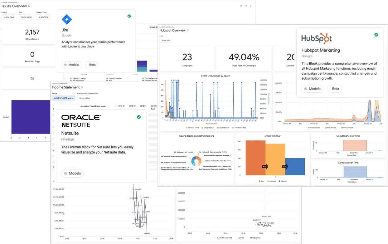 Google Cloud, through the Looker Marketplace and Looker blocks, has provided a limited form of packaged analytics solutions for Looker customers such as those in the screenshots below for Jira, NetSuite and Hubspot.