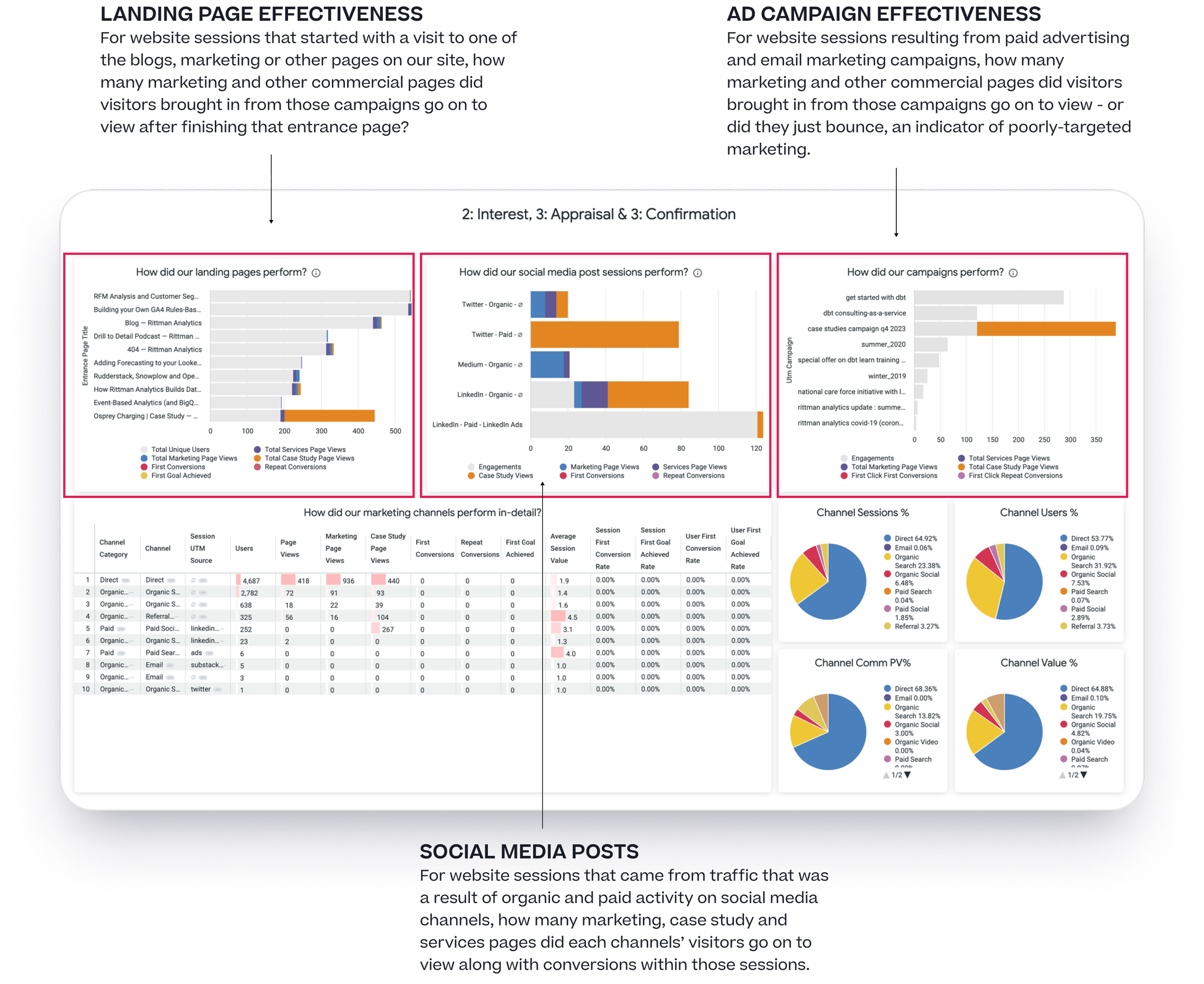 For each of the marketing channels that bring visitors to our website along with blog articles and the marketing, services and case-study pages on our site, our measurement of performance is how effective each were in moving those visitors down through our marketing funnel.