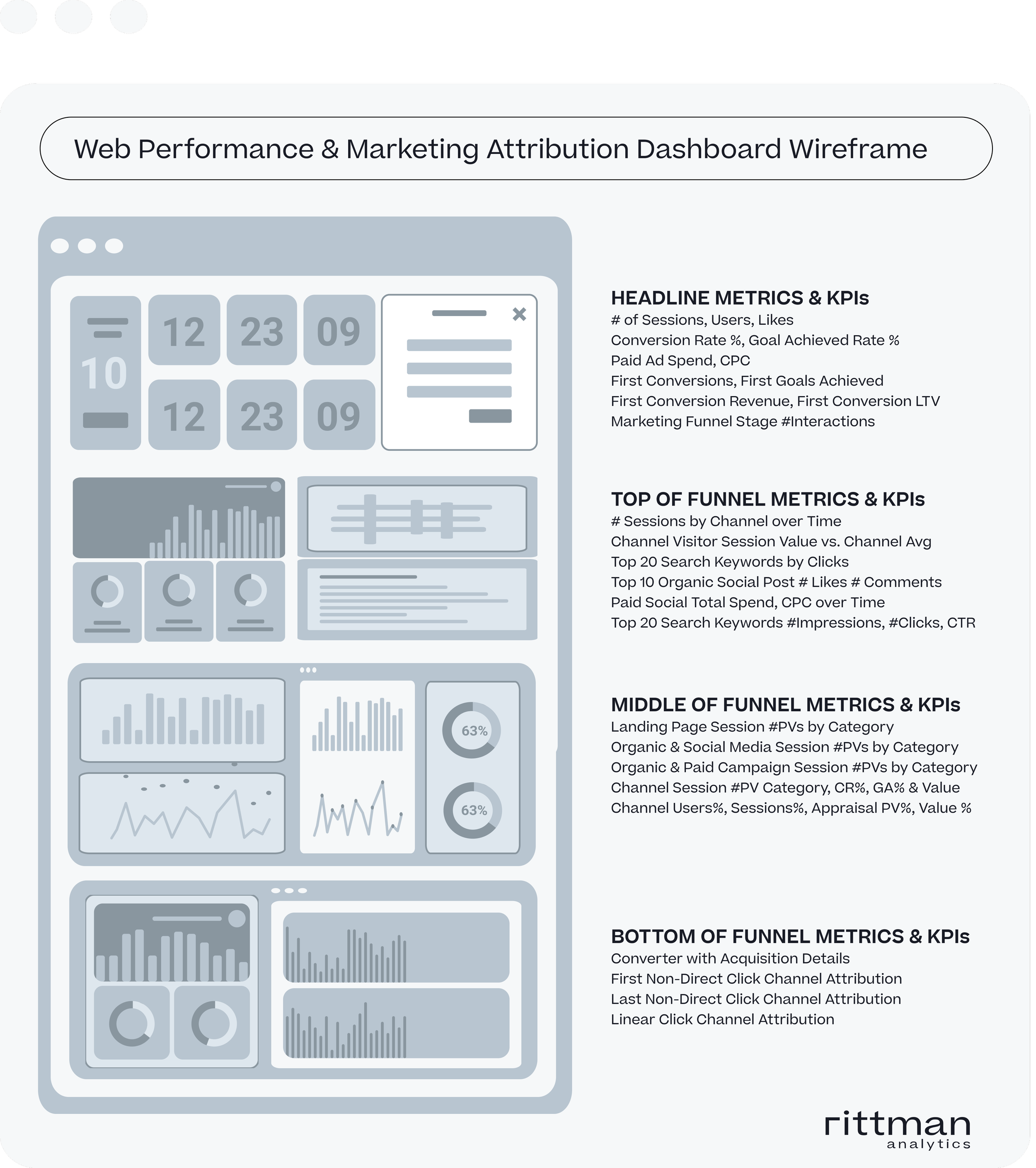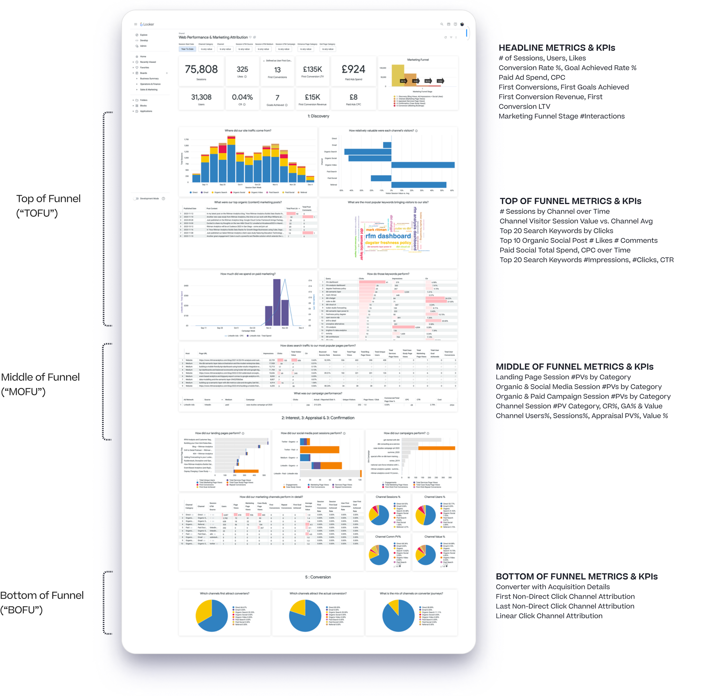 The Web Performance and Marketing Attribution dashboard is shown in the screenshot below, where we’ve taken the wireframe design and used it as the design template for a Looker dashboard.