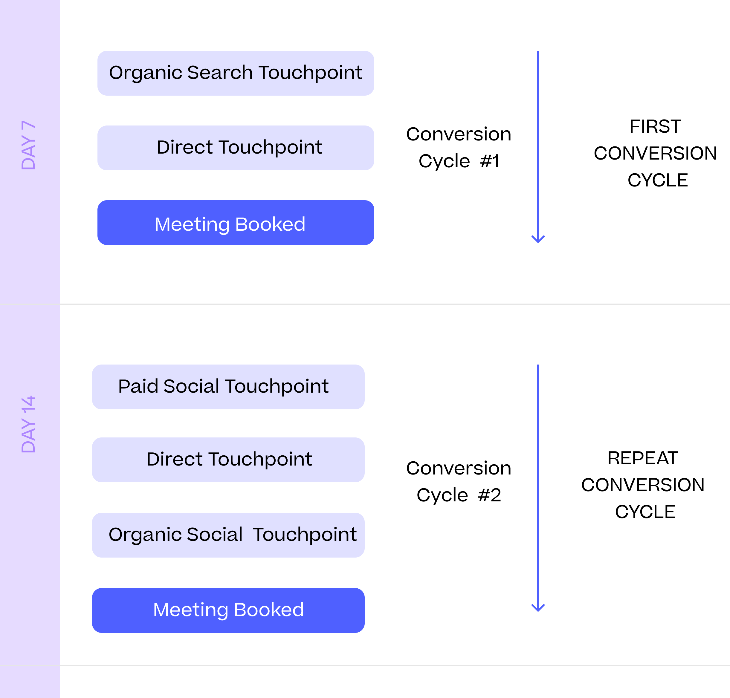 We do this by leveraging the multi-touch, multi-cycle marketing attribution dbt package we’ve made available on our public Github account (along with a Looker block version optimized for Google Analytics 4) and used it, together with the identity-stitching logic outlined earlier in this blog to attribute the value of each users’ conversion across each separate conversion cycle, as you can see in the recent example shown below.
