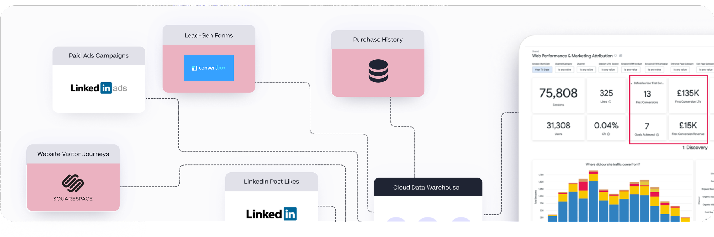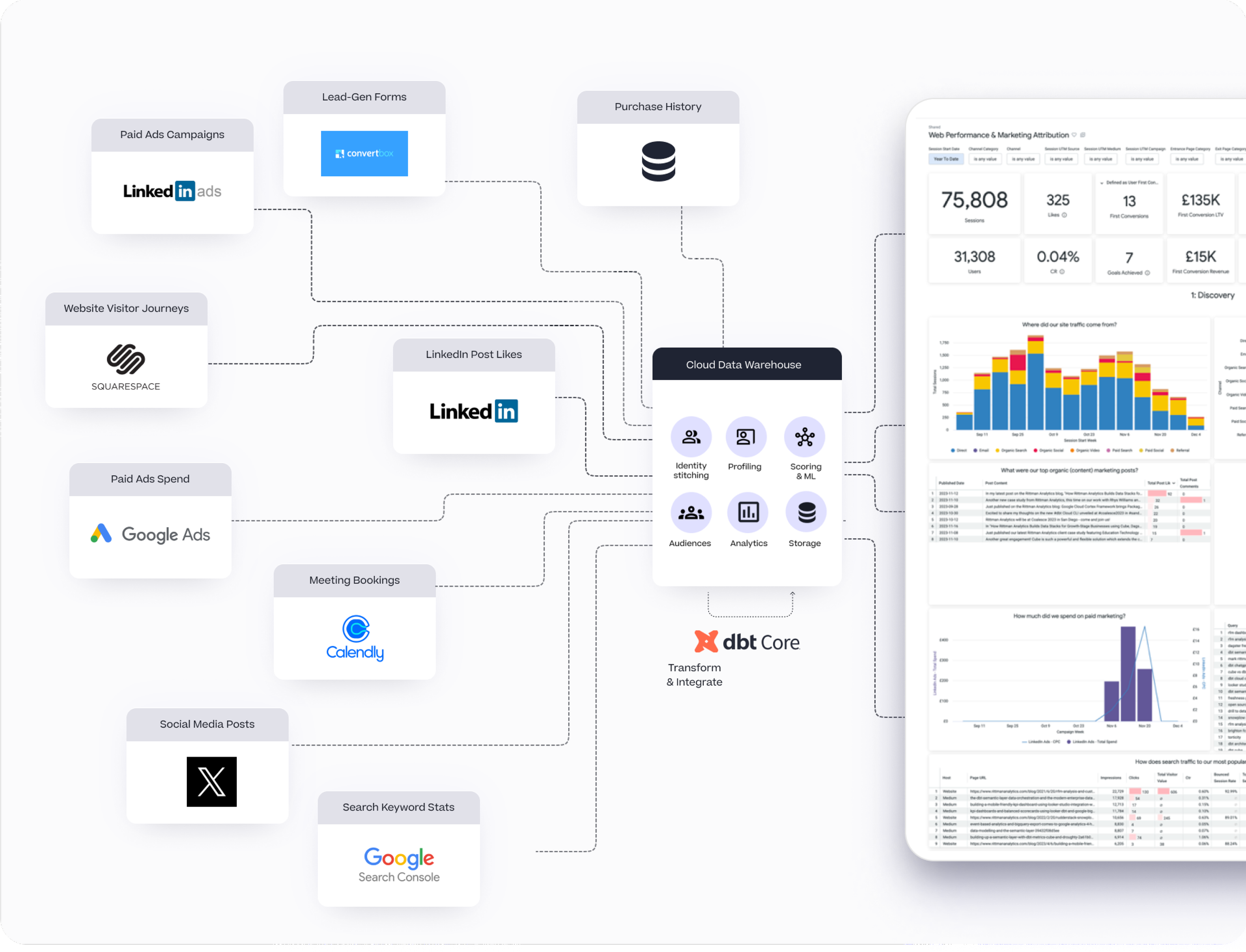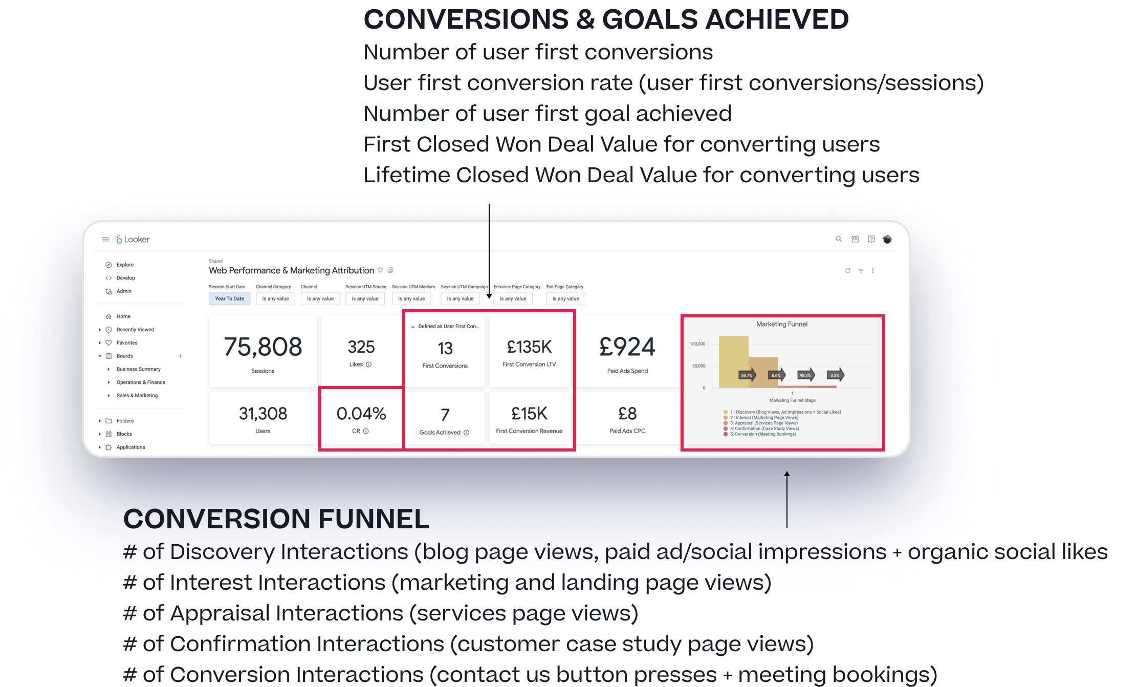 Creating such as dashboard that spanned all of our marketing activities, visitor digital touchpoints and data on their transaction history required us to bring data in from a number of different data sources including website clickstream data, lead collection and meeting booking data from third-party services such as ConvertBox and Calendly, ad network and social media data as well as operational stored in our centralised data warehouse, Google BigQuery.