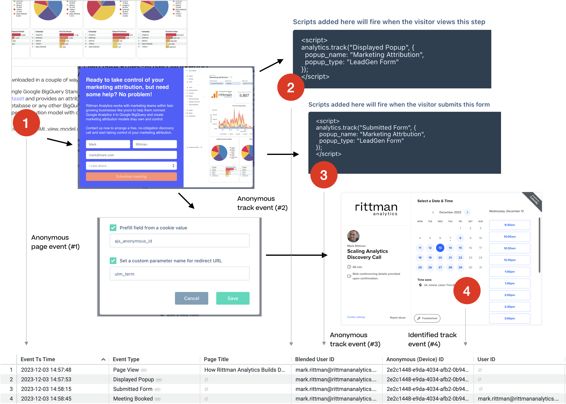 To emphasise the value of these first meetings we identity-stitched the anonymous and identified website interactions for each of our converting users, making sure that at all times when we hand-off a user to a third-party service such as Calendly or ConvertBox we always include the device-based anonymousId that Segment assigns to each site visitor.