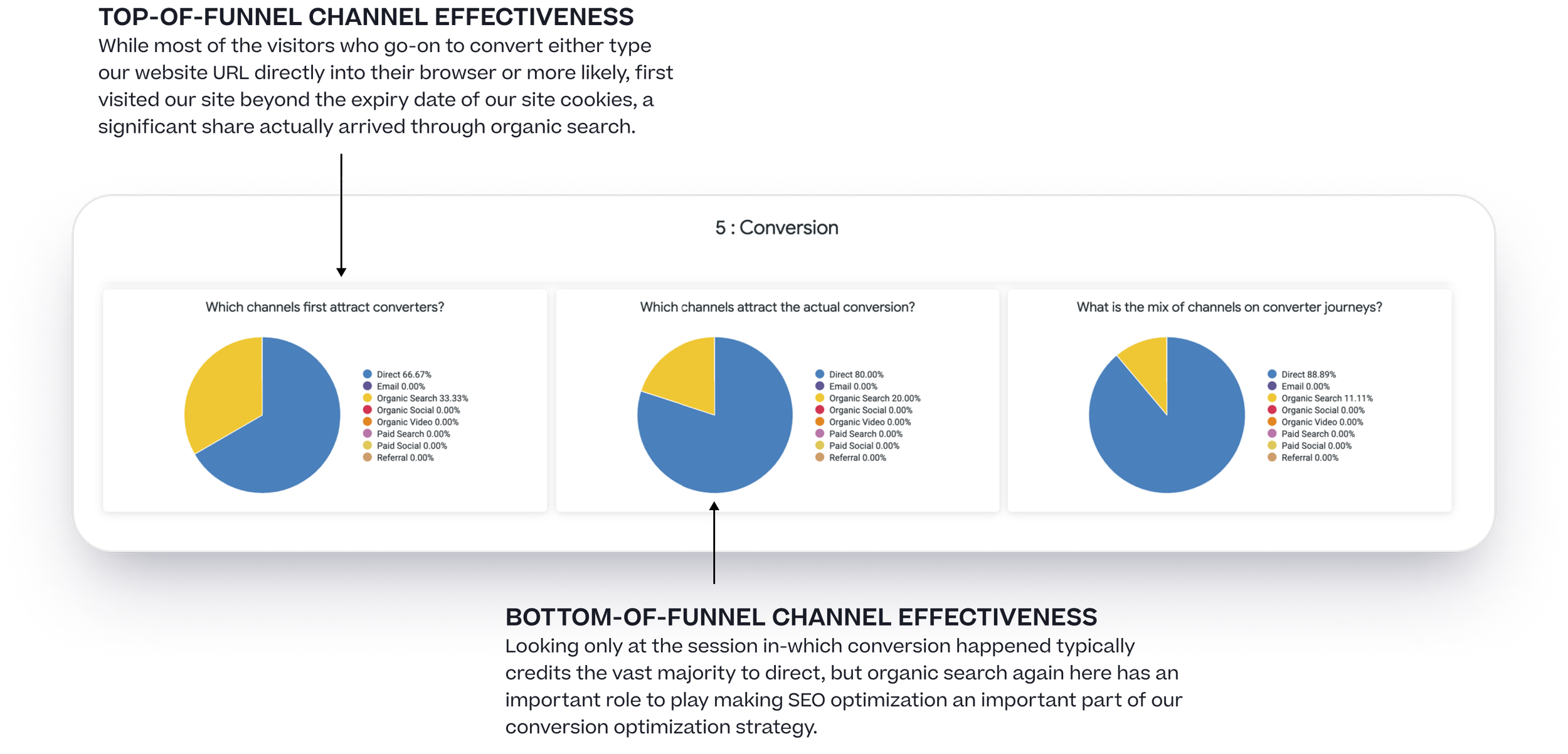 We then use the first non-direct click, last non-direct click and even (linear)-click attribution model data to provide visualizations for the final marketing funnel layer of our dashboard,