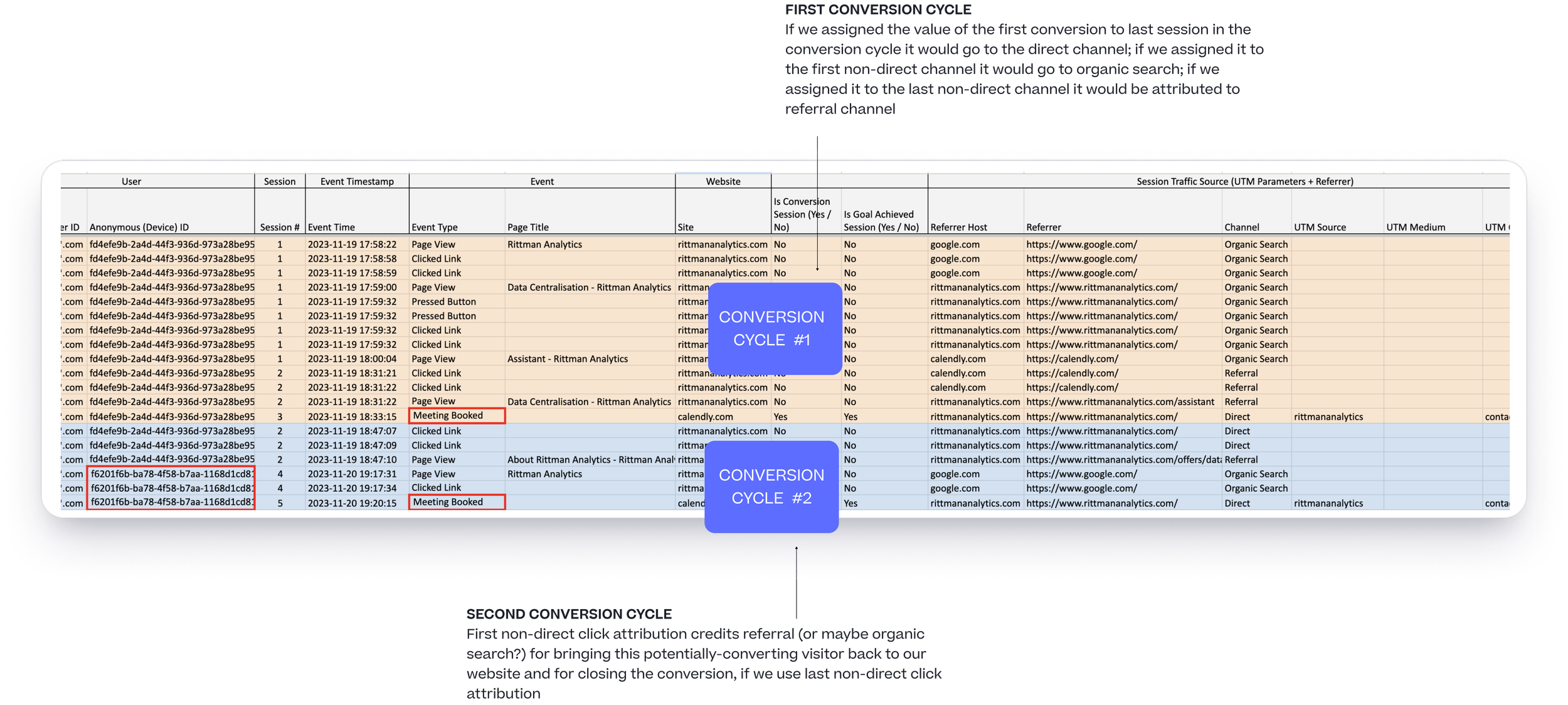That same user might not be in a position to move ahead right then with their project but returns a week later after being reminded of us through a paid social post on LinkedIn, gets distracted and then finally types our website address into their browser, clicks on the button to book a meeting and converts for a second time.