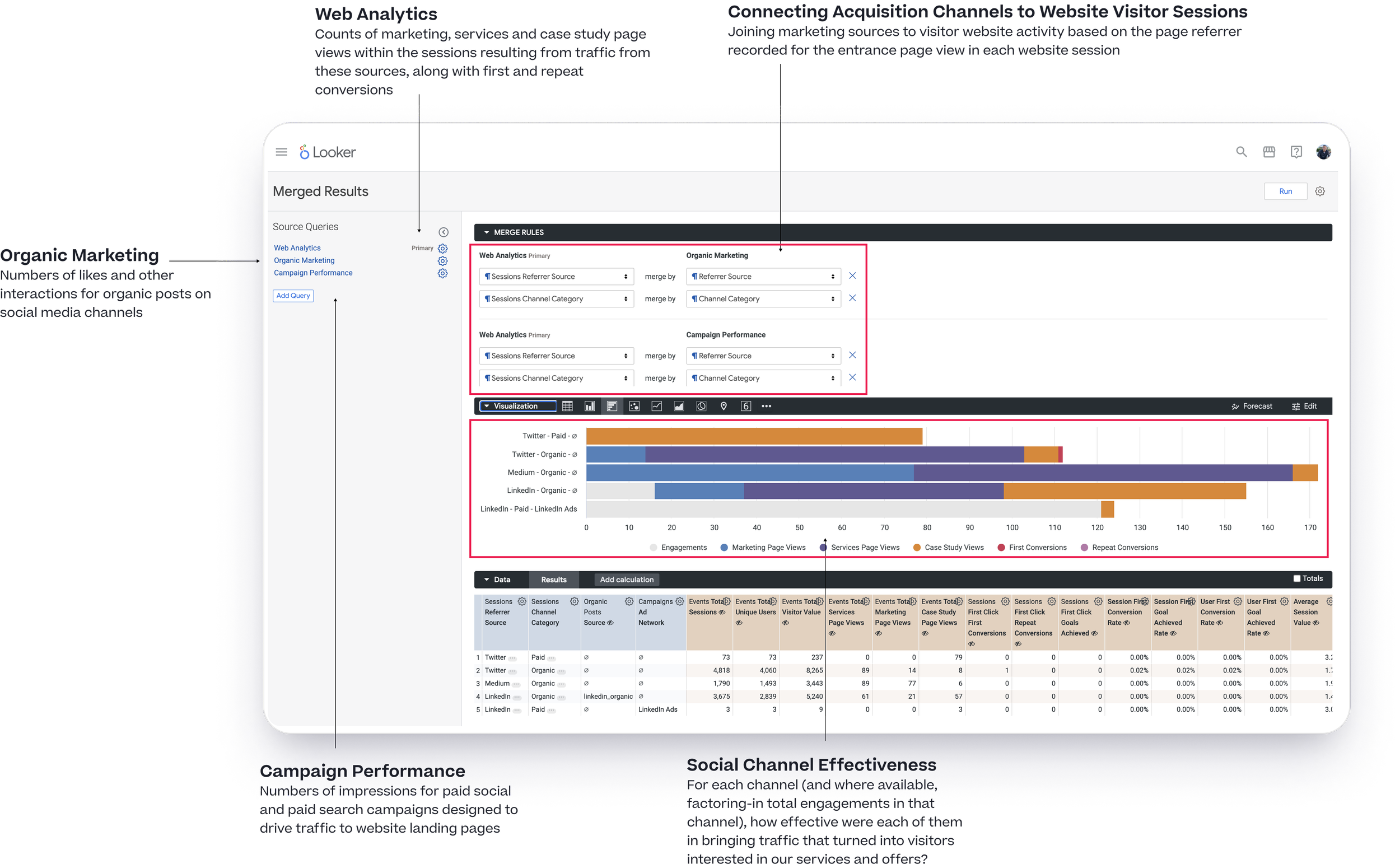 Data visualisations such as these that connect-together activity at one stage in the marketing funnel — interacting with a post we published on LinkedIn, liking an X tweet or clicking on a paid social promotion, for example — with subsequent session page view data from the website sessions resulting from those interactions — are easy to set-up in Looker using the Merge Query feature, as you can see from the example below.