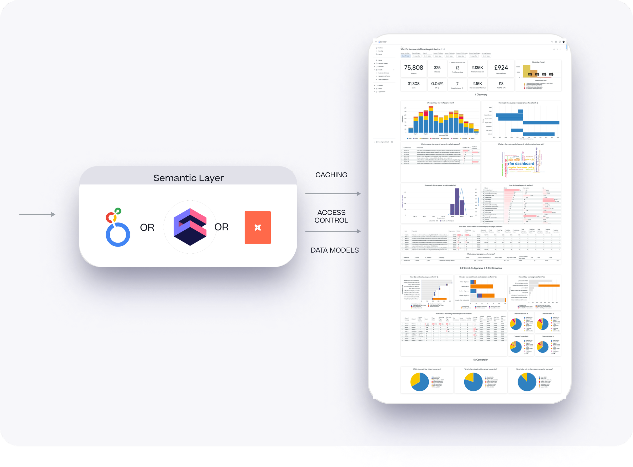 A semantic layer that provides for business users a layer of abstraction over the data in your warehouse as well as caching, access control and APIs to enable embedding within your user-facing applications