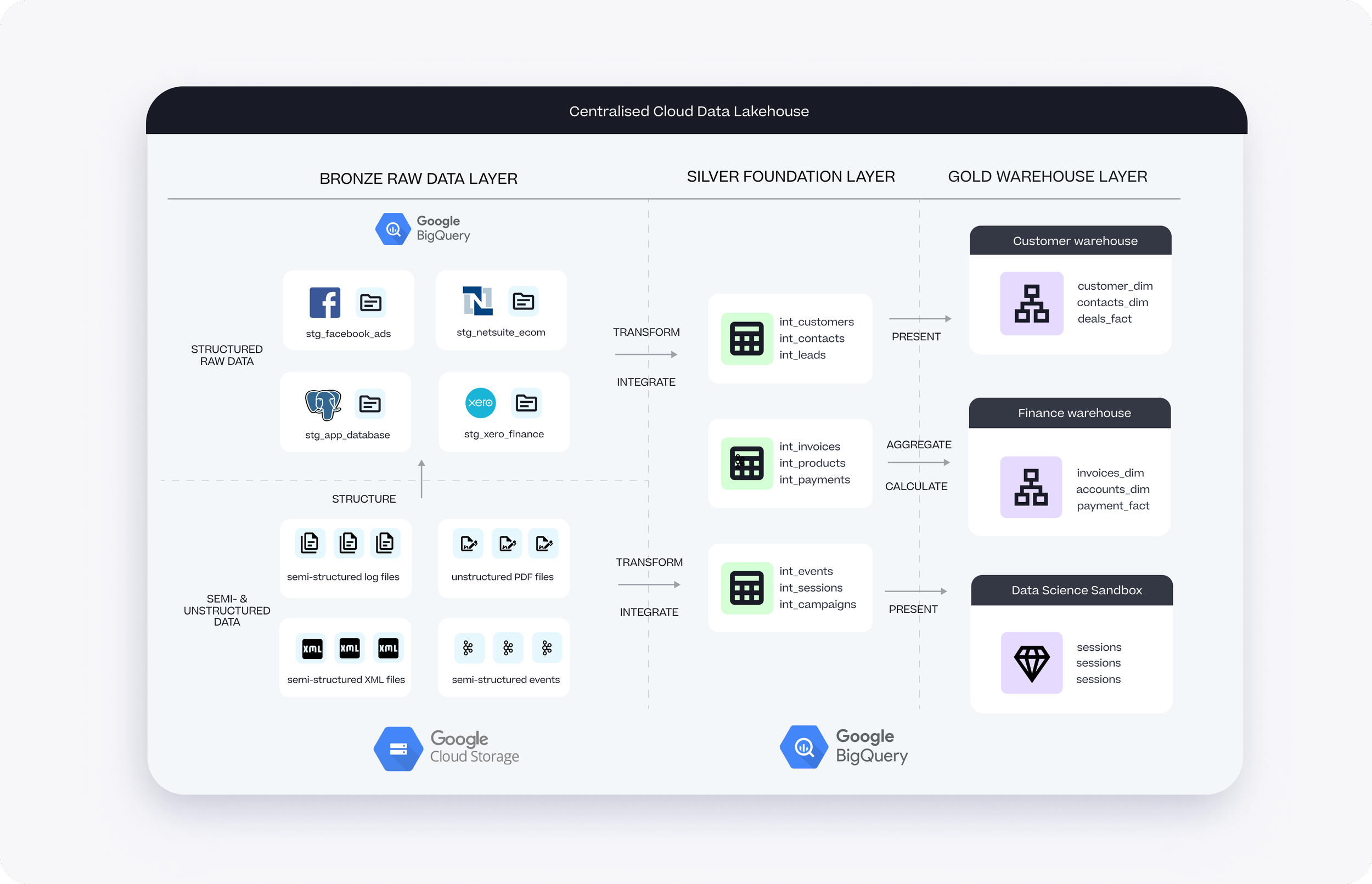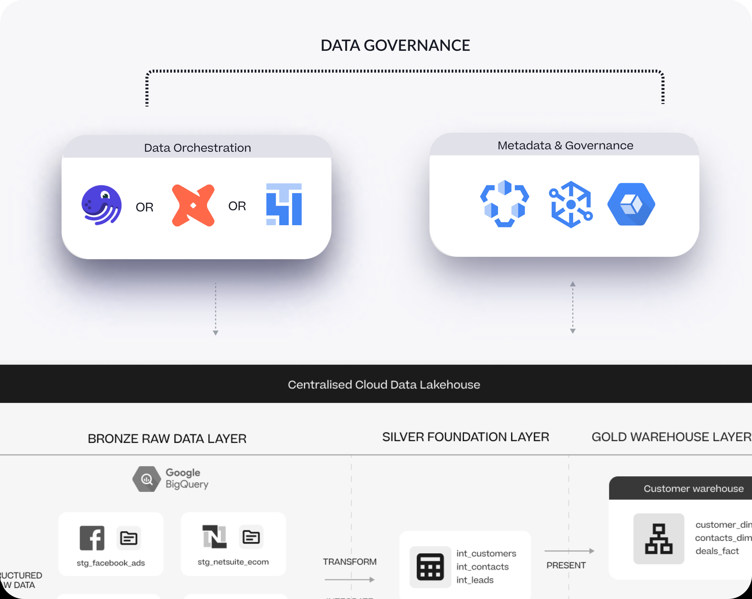 Data ingestion is a good example in that, whilst there are services such as Cloud Dataflow, PubSub and BigQuery Data Transfer Service that can automate the loading of data into your BigQuery warehouse, we typically recommend third-party services such as Fivetran and Airbyte as they’re more feature-complete than DTS and don’t require custom development as the other platform-native options do.
