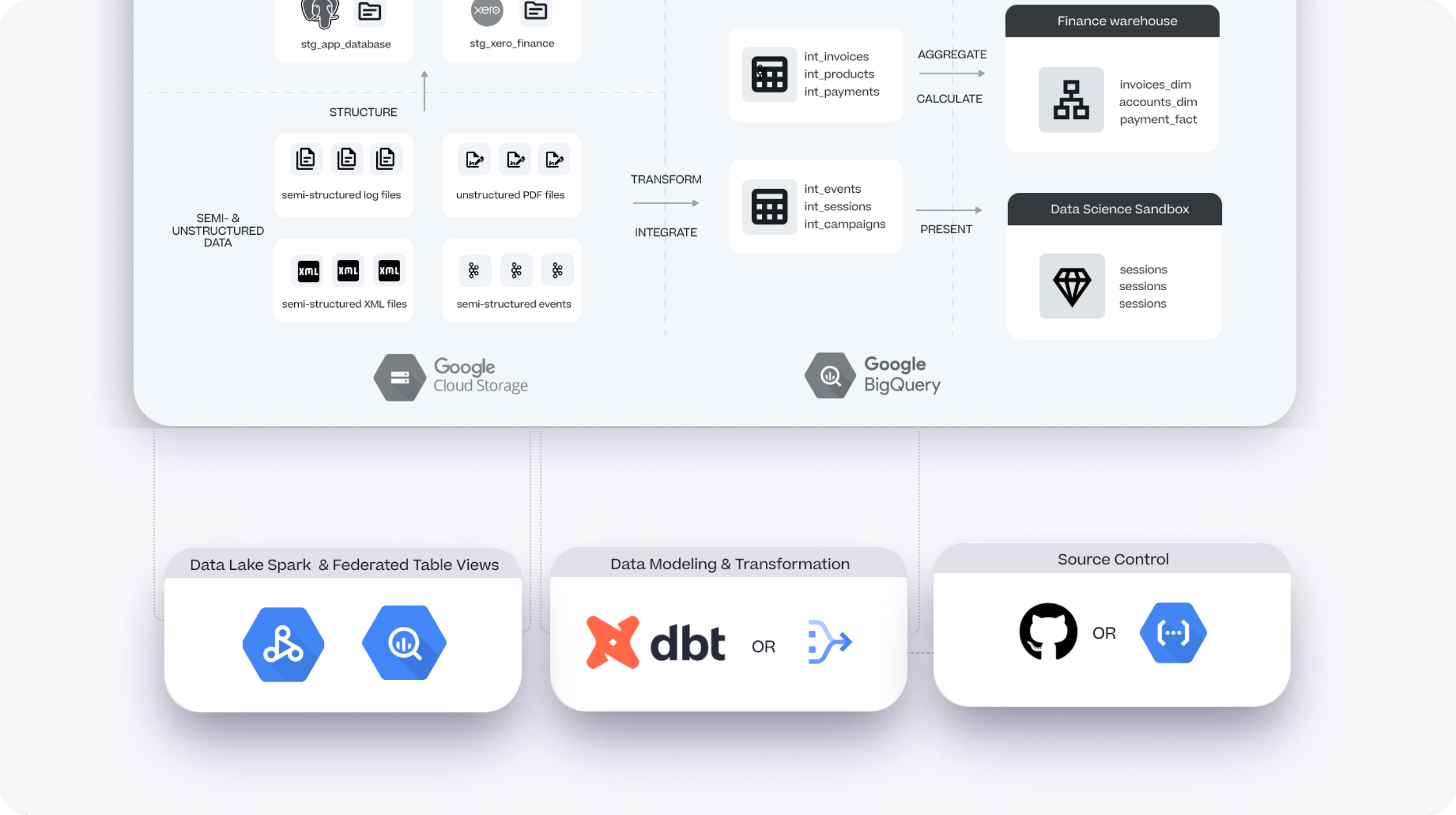 Data transformation is well-handled by dbt Core, the open-source transformation and modeling toolkit that generates SQL and Python / Cloud Dataproc code to transform data between layers in your warehouse; we are however seeing uptake of Dataform (a transformation toolkit similar in functionality to dbt but more closely integrated with BigQuery and Google Cloud) incentivised by the fact that like dbt Core it’s free to use, but any associated running costs can be paid-for our of their Google Cloud commit rather than having to deal with yet another vendor.