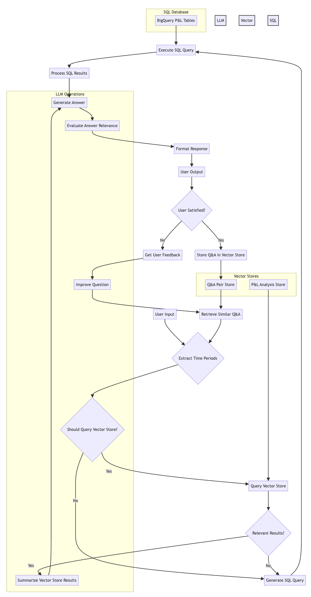 Vector Store (BigQuery): A BigQueryVectorStore table is used to store embeddings of pre-created P&L analysis texts, as shown in the SQL example below. This allows for efficient similarity search to quickly find relevant context for user questions. The table pl_reports_vector_storage holds these embeddings. A separate vector store, successful_qa_pairs, is used to store successful question-answer pairs for learning and improving the system's performance.