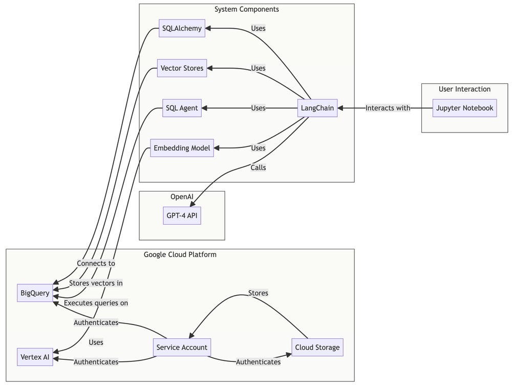 SQL Agent (Langchain): An SQL agent is used to directly query BigQuery when the vector store does not contain sufficient information to answer a question.