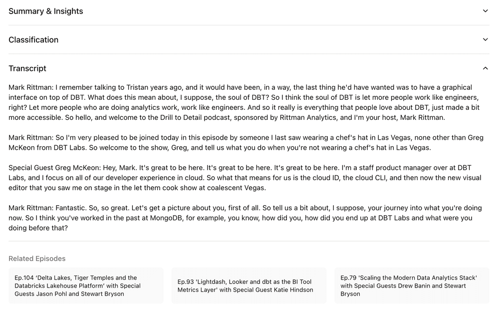 And finally the BigQuery dataset then becomes the data source for the https://podcasts.rittmananalytics.com web application, with the screenshot below showing an example episode transcript.