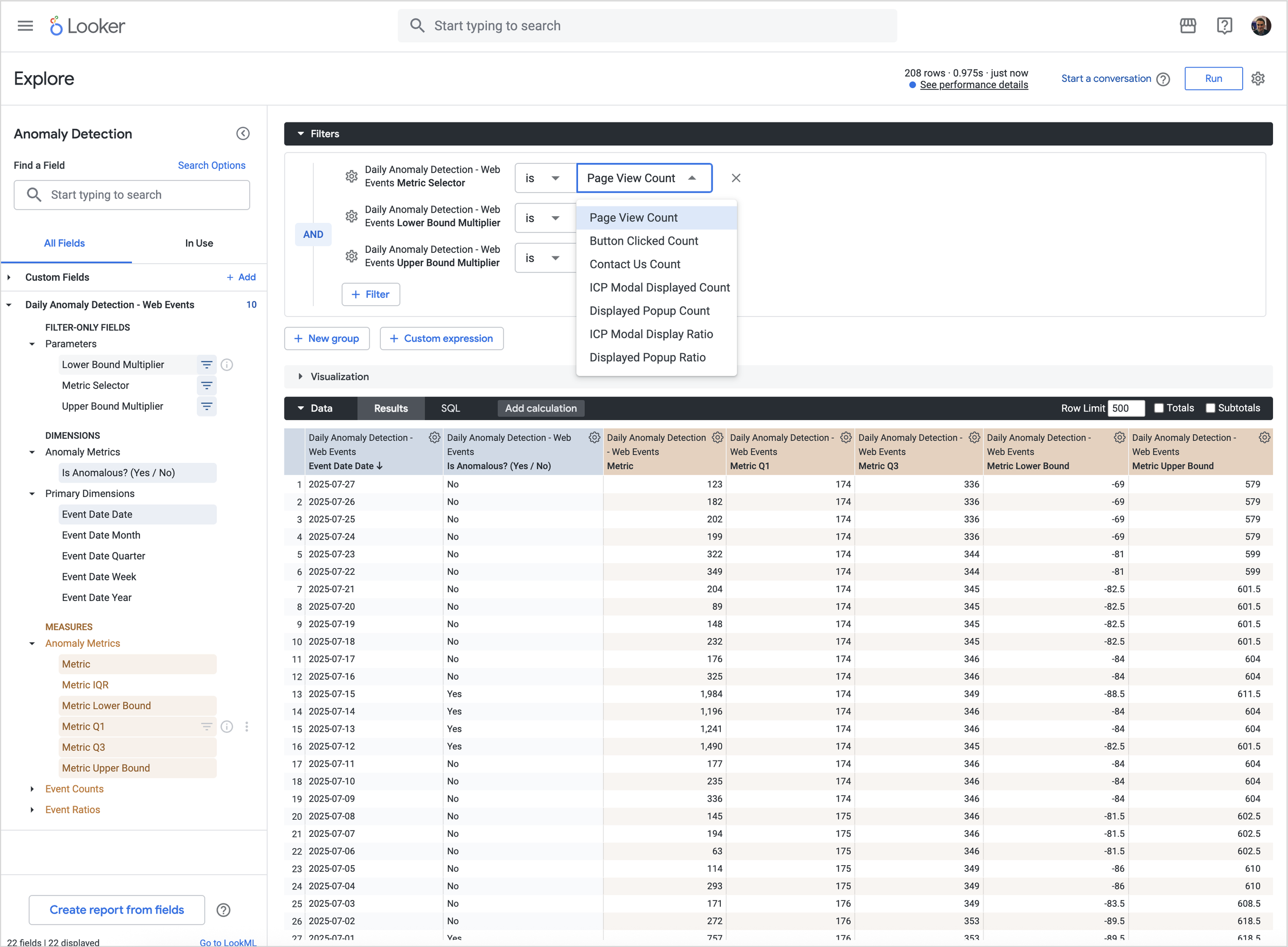 parameter: anomaly_metric { allowed_value: {label: "Page View Count" value: "PAGE_VIEW_COUNT"} allowed_value: {label: "Button Clicked Count" value: "BUTTON_CLICKED_COUNT"} allowed_value: {label: "Contact Us Count" value: "CONTACT_US_COUNT"} allowed_value: {label: "ICP Modal Displayed Count" value: "ICP_MODAL_DISPLAYED_COUNT"} allowed_value: {label: "Displayed Popup Count" value: "DISPLAYED_POPUP_COUNT"} allowed_value: {label: "ICP Modal Display Ratio" value: "ICP_MODAL_DISPLAYED_RATIO"} allowed_value: {label: "Displayed Popup Ratio" value: "DISPLAYED_POPUP_RATIO"} default_value: "PAGE_VIEW_COUNT" type: unquoted label: "Metric Selector" group_label: "Parameters" description: "Choose which metric (count or ratio) to evaluate for anomalies." } parameter: upper_bound_multiplier { allowed_value: {label: "1.0" value: "1.0"} allowed_value: {label: "1.5" value: "1.5"} allowed_value: {label: "2.0" value: "2.0"} allowed_value: {label: "2.5" value: "2.5"} default_value: "1.5" type: unquoted label: "Upper Bound Multiplier" group_label: "Parameters" description: "Multiplier applied to the IQR to calculate the upper threshold for anomaly detection." } parameter: lower_bound_multiplier { allowed_value: {label: "0.0" value: "0.0"} allowed_value: {label: "0.5" value: "0.5"} allowed_value: {label: "1.0" value: "1.0"} allowed_value: {label: "1.5" value: "1.5"} allowed_value: {label: "2.0" value: "2.0"} allowed_value: {label: "2.5" value: "2.5"} default_value: "1.5" type: unquoted label: "Lower Bound Multiplier" group_label: "Parameters" description: "Multiplier applied to the IQR to calculate the lower threshold for anomaly detection." }These parameters work together with dynamic measures that adjust based on the selected metric, like so: