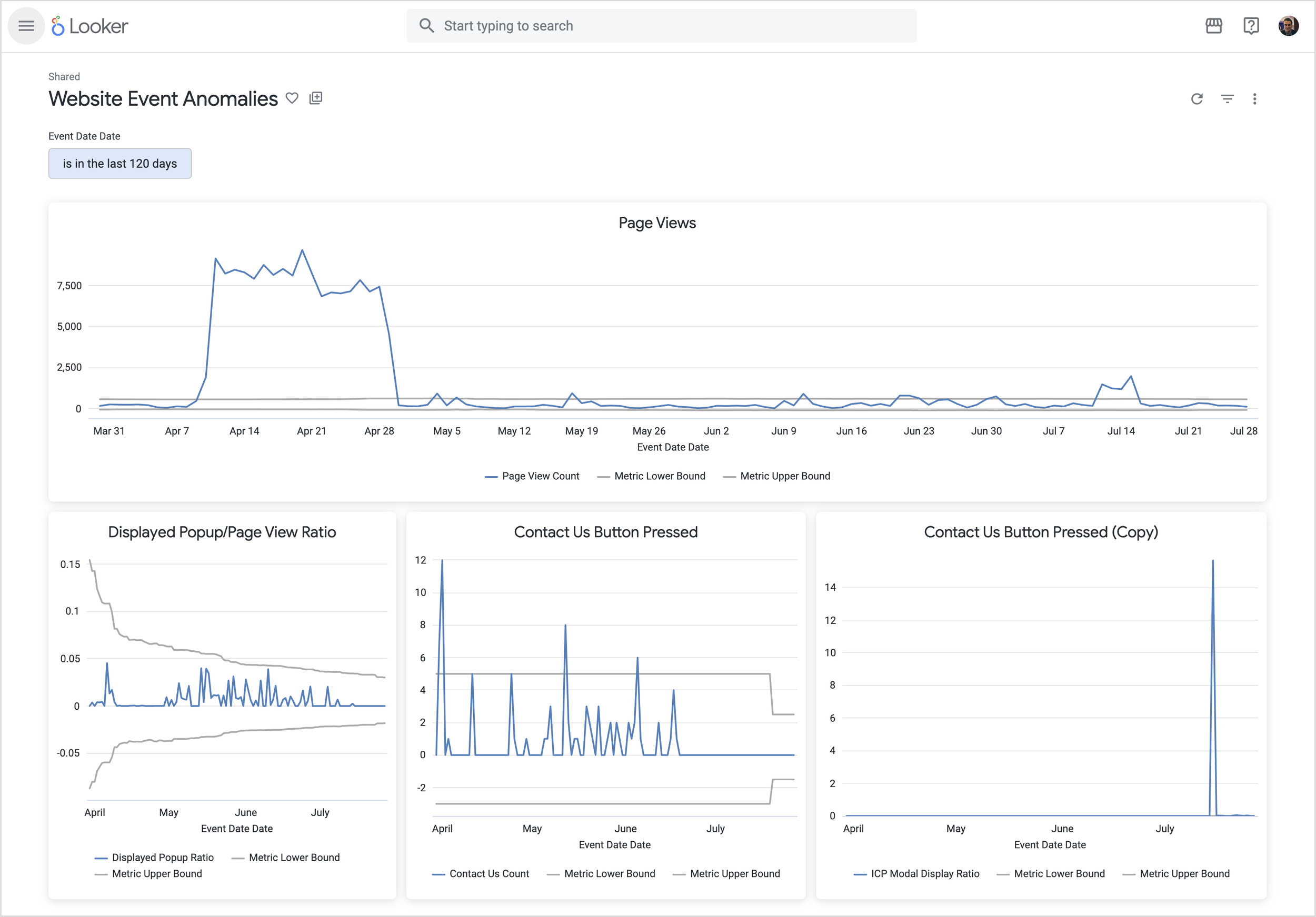 While the Explore feature is excellent for ad-hoc analysis, you can also build a monitoring dashboard that gives you an at-a-glance view of all your critical anomaly-detection metrics. In the screenshot below you can see a simple example of an Anomaly Detection Dashboard in Looker, to which you could also add alerts to tell us, for example, when page views or popup display frequency ratios yesterday were anomalous compared to the norm.