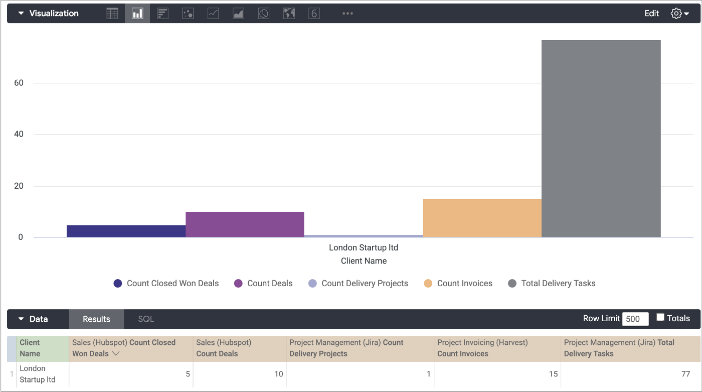 Doing this allows you to connect sales activity from Salesforce and Hubspot to project delivery and invoicing data from Jira and Xero, for example: