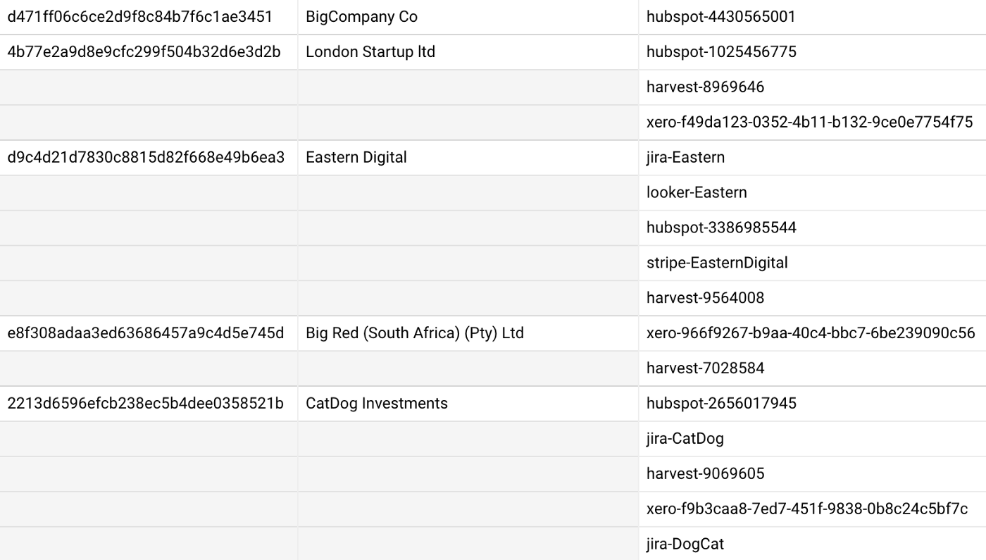 For fields where we’d need to record a number of values for each company, for example when recording the various source system IDs we’ll need to have available when linking invoices coming from Xero, deals from Hubspot and payments from Stripe, we make use of repeating columns when working with Google BigQuery target data warehouses, like this: