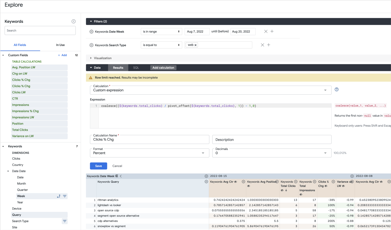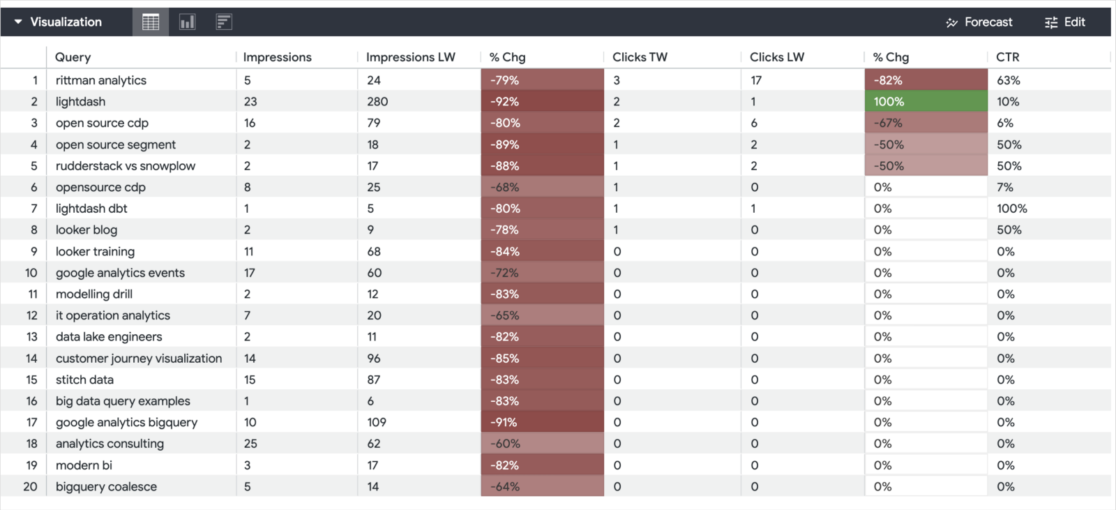 I started by filtering those search stats to just the two weeks that span the old site going offline and the new one coming online, I pivot those two weeks in my explore results and calculate a bunch of variance, % variance and positional measures to create a look that will show me the change in clicks, impressions and average search position as we transitioned to the new site version.