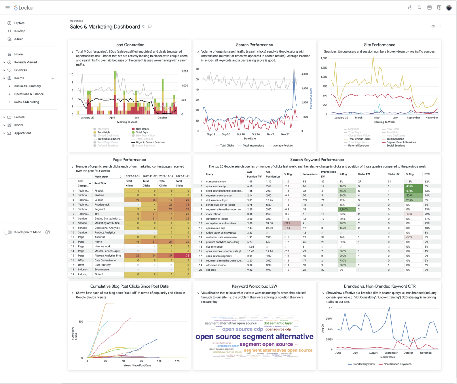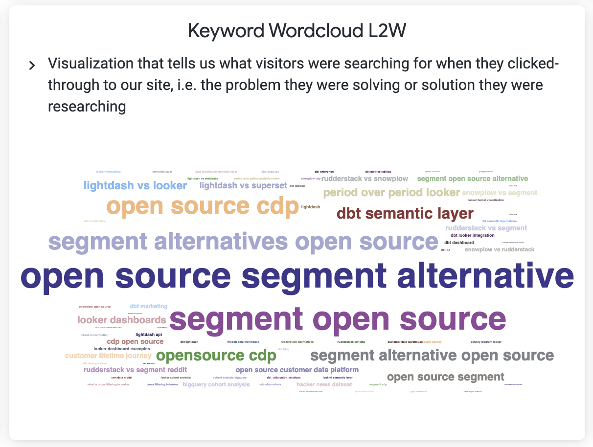 And finally, putting the set of query keywords that led to clicks to our site into a Looker word cloud visualization, for example, shows us that last week it was interest around open-source alternatives to Segment that brought visitors to our website, an insight into what’s on potential clients’ minds that we can use to better focus our marketing activity in January.