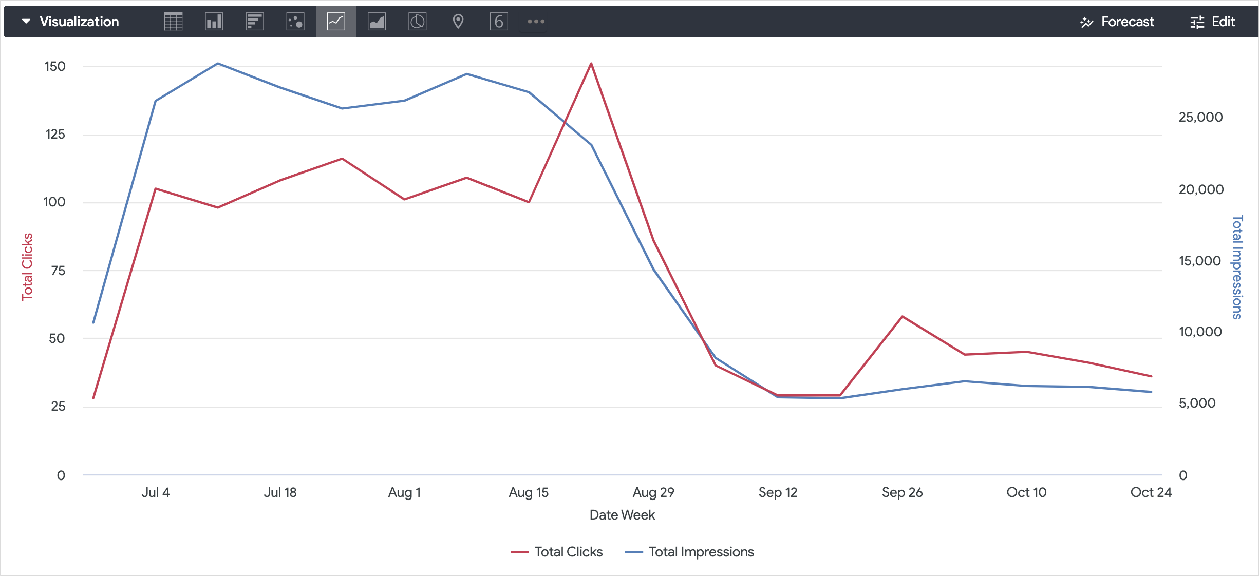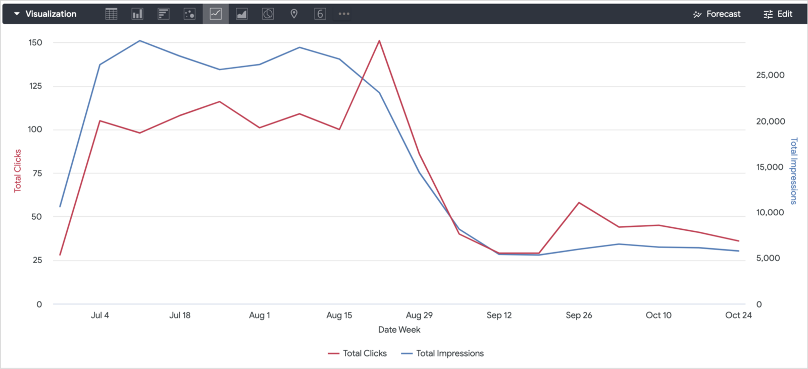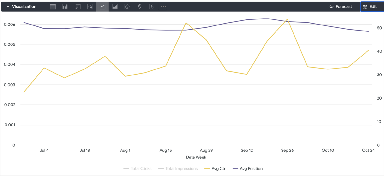 I now had a Looker explore that gave me, per week, the volume of traffic we’d received at the site along with the clicks, impressions, average search results position and average click-through-rate for traffic coming to those pages from Google Search users.