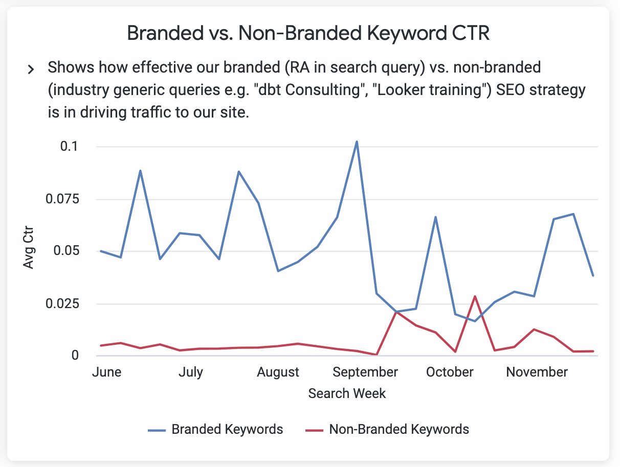 For example, splitting our search keyword click-through-rate into branded (anything with ‘rittman’ in the query keywords) and non-branded (queries such as ‘dbt metrics layer’) shows that we’ve still got some work to do to increase click-throughs on the latter.