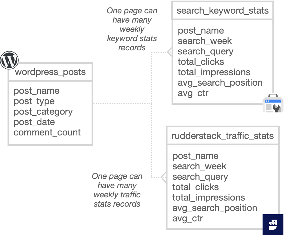 Next I took our existing Rudderstack page event data, aggregated it to the week level and transformed the path context variable into a format that could be used to join these page events to the page_name format that WordPress uses (code here), and then aggregated the Keyword Page Report table data to the same week-level (code here) and then finally, added a new explore to our Looker model to join them all together on the page_name WordPress page URL slug.