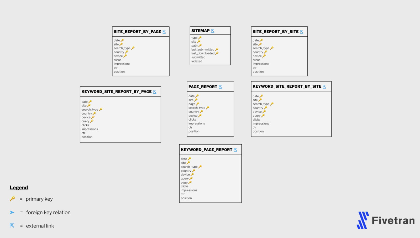 The schema provided by Fivetran for data replicated into your warehouse from the API provided for Google Search Console consists of a number of report-style tables that aggregate your search data by various combinations of site, keyword, page and time dimensions.