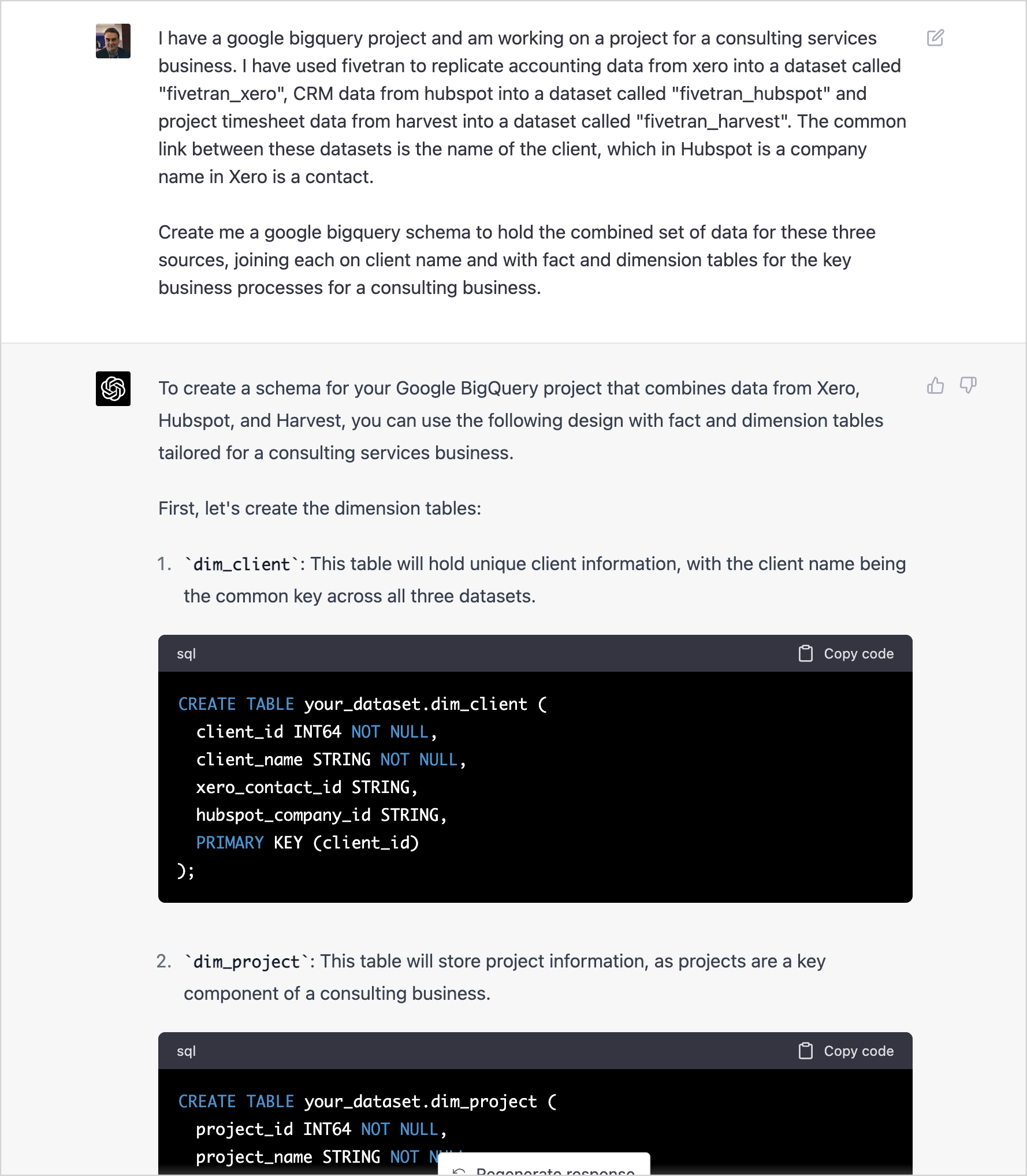 ChatGPT goes straight into defining a reasonable starting schema, though it makes a basic SQL syntactical error right at the get-go. BigQuery does, in-fact, now support primary and foreign key constraints but doesn’t enforce them, using them instead to provide additional schema metadata to BigQuery’s query planner and the correct syntax for this new DDL feature is PRIMARY KEY (column_name) NOT ENFORCED.