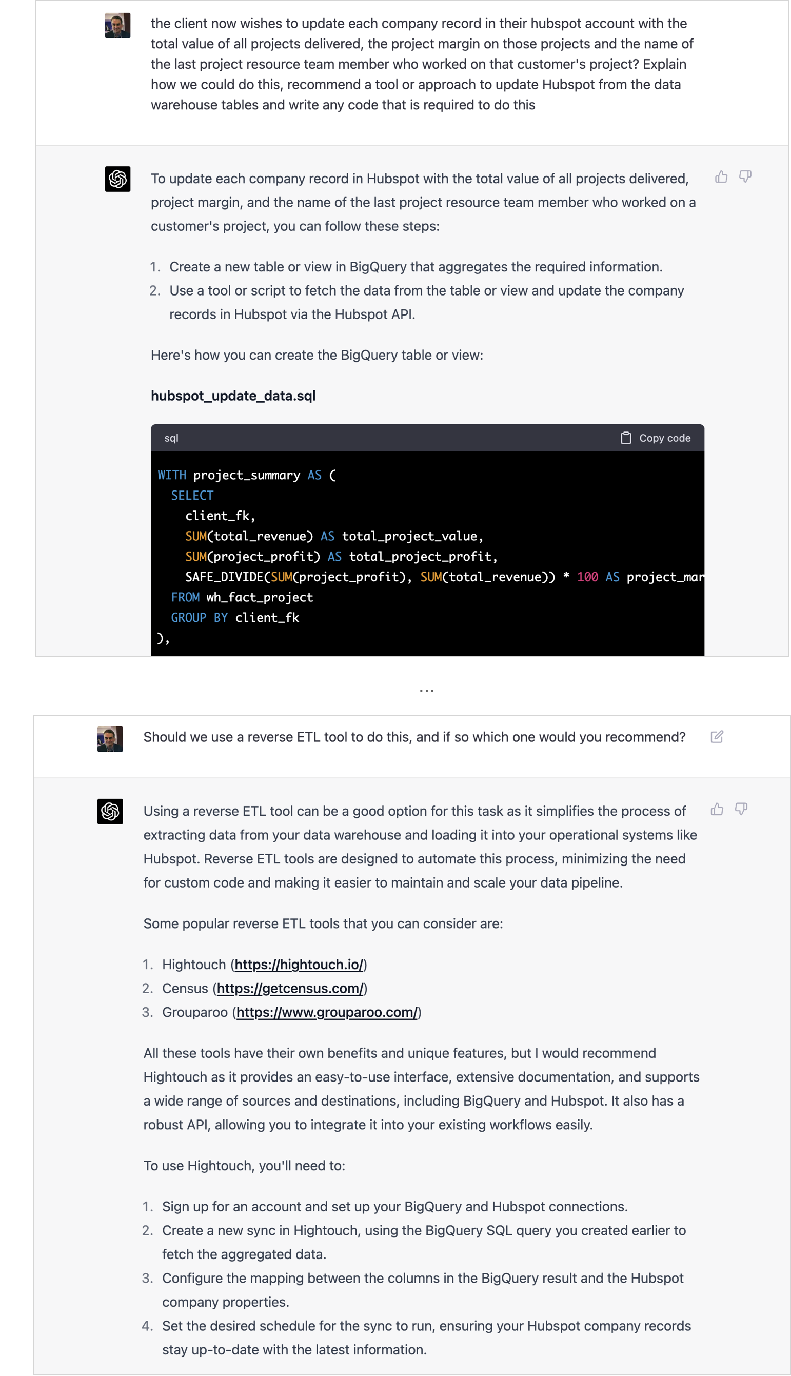 ChatGPT isn’t short of an opinion on technology choices though, if you ask it to give you a technology recommendation. After initially asking it to give me a way to sync data from the warehouse back into our Hubspot CRM, I then ask it whether a Reverse ETL tool would be a better solution and if so, to recommend one.
