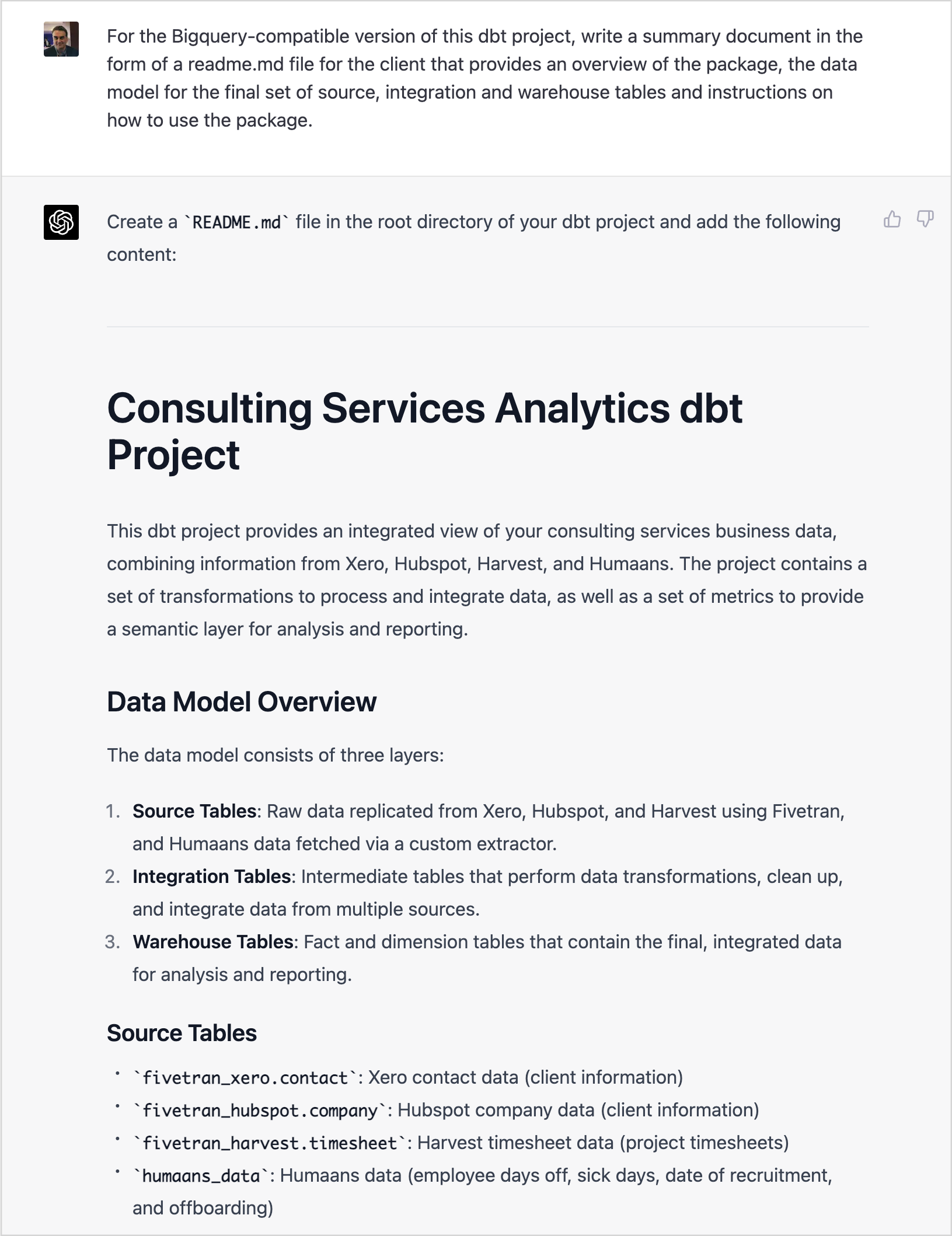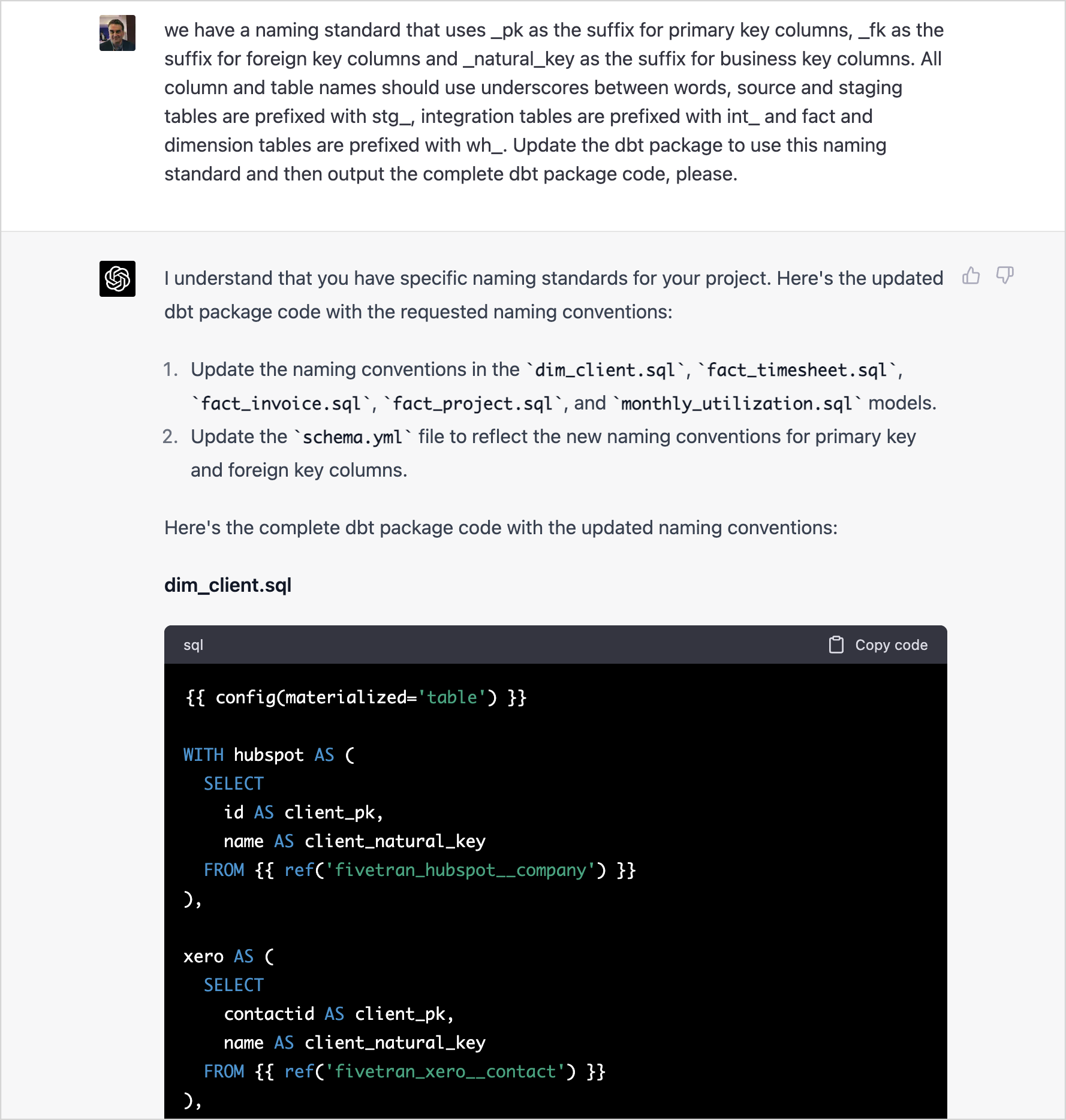 More significantly though if you’re a freelancer taking on dbt work on sites such as Fiverr or a junior developer learning your trade by churning out dbt code tightly-specified by a solution architect, ChatGPT can most probably do that job better.
