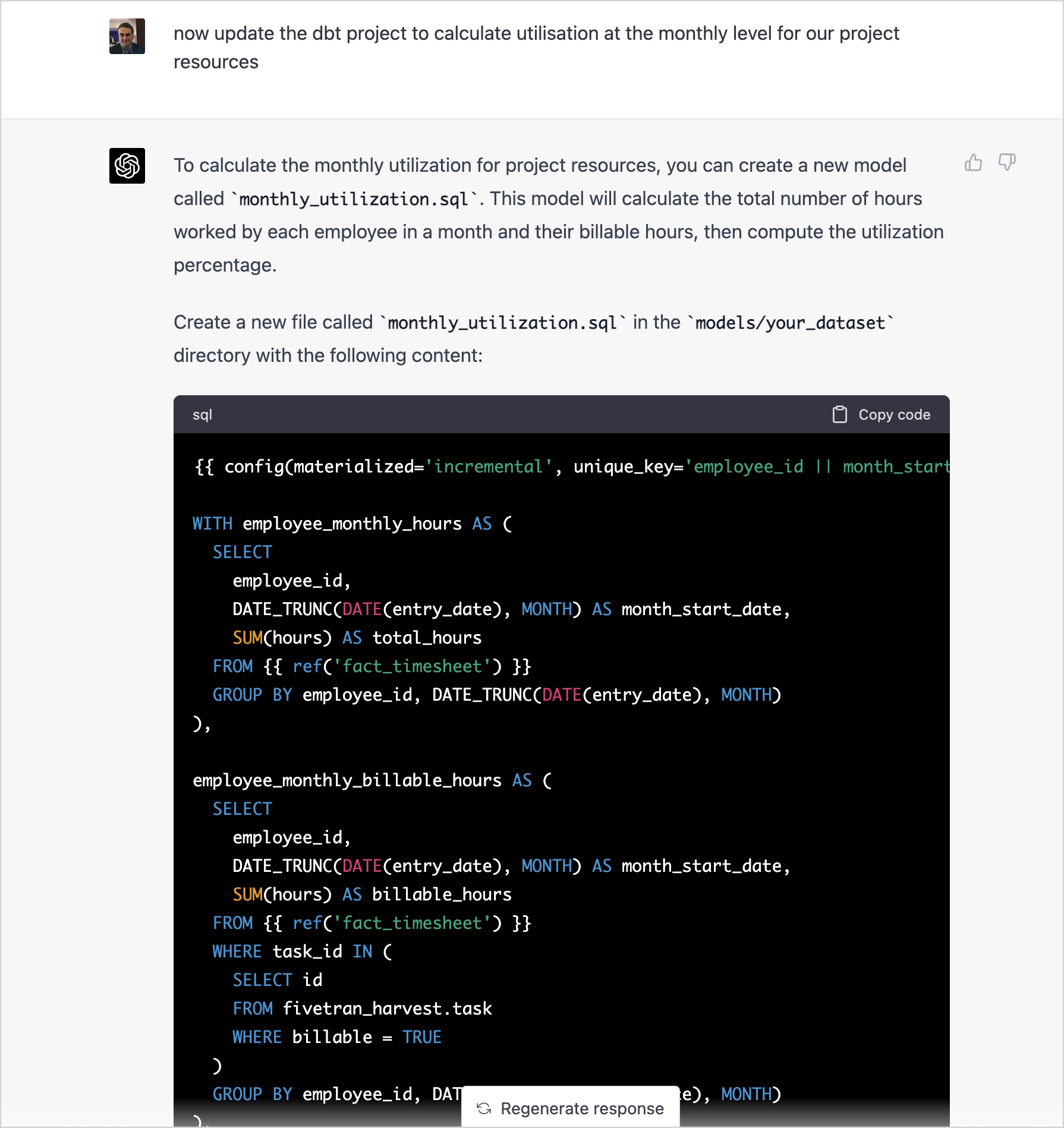 I then ask ChatGPT to create a dbt package that takes the raw data from each of the Fivetran-sourced staging datasets, integrates and transforms it and then loads it into the fact and dimension tables it just defined a schema for.
