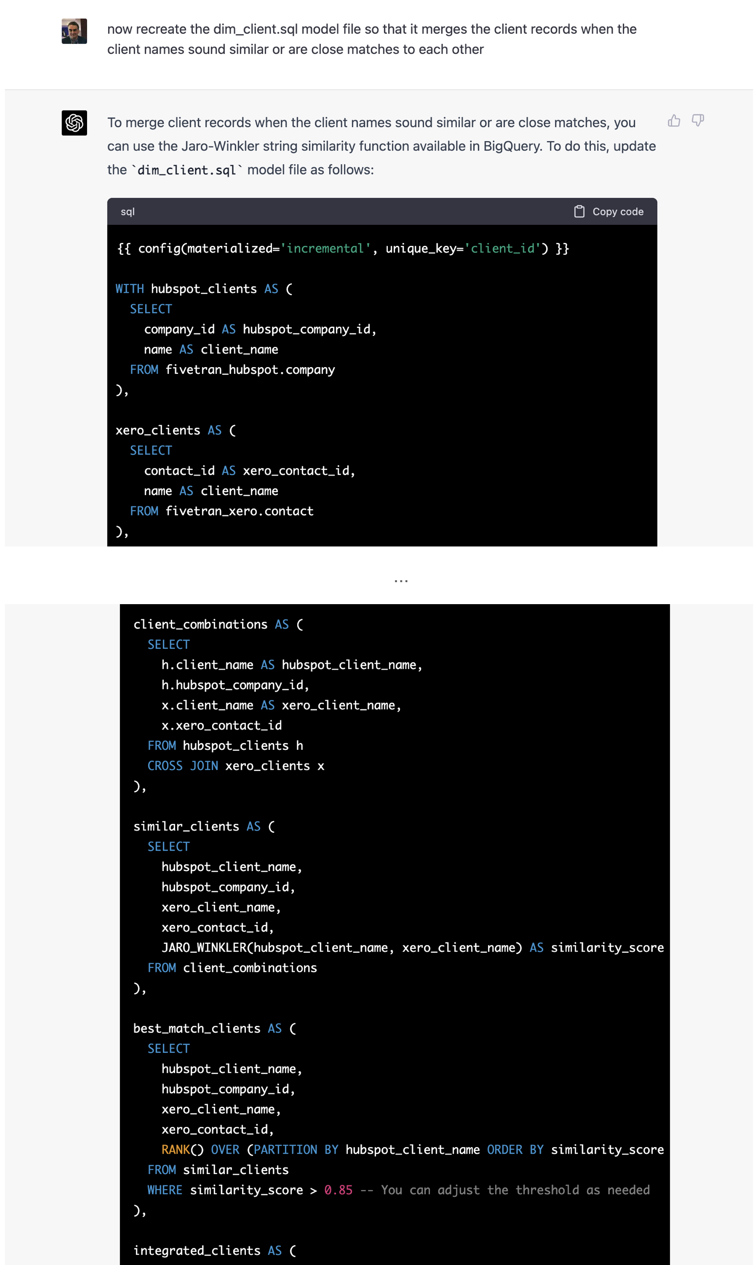 ChatGPT confidently offers to do this using BigQuery’s Jaro-Winkler string similarity function, and rewrites the dbt code for me. Neat — I hadn’t even heard of this function.