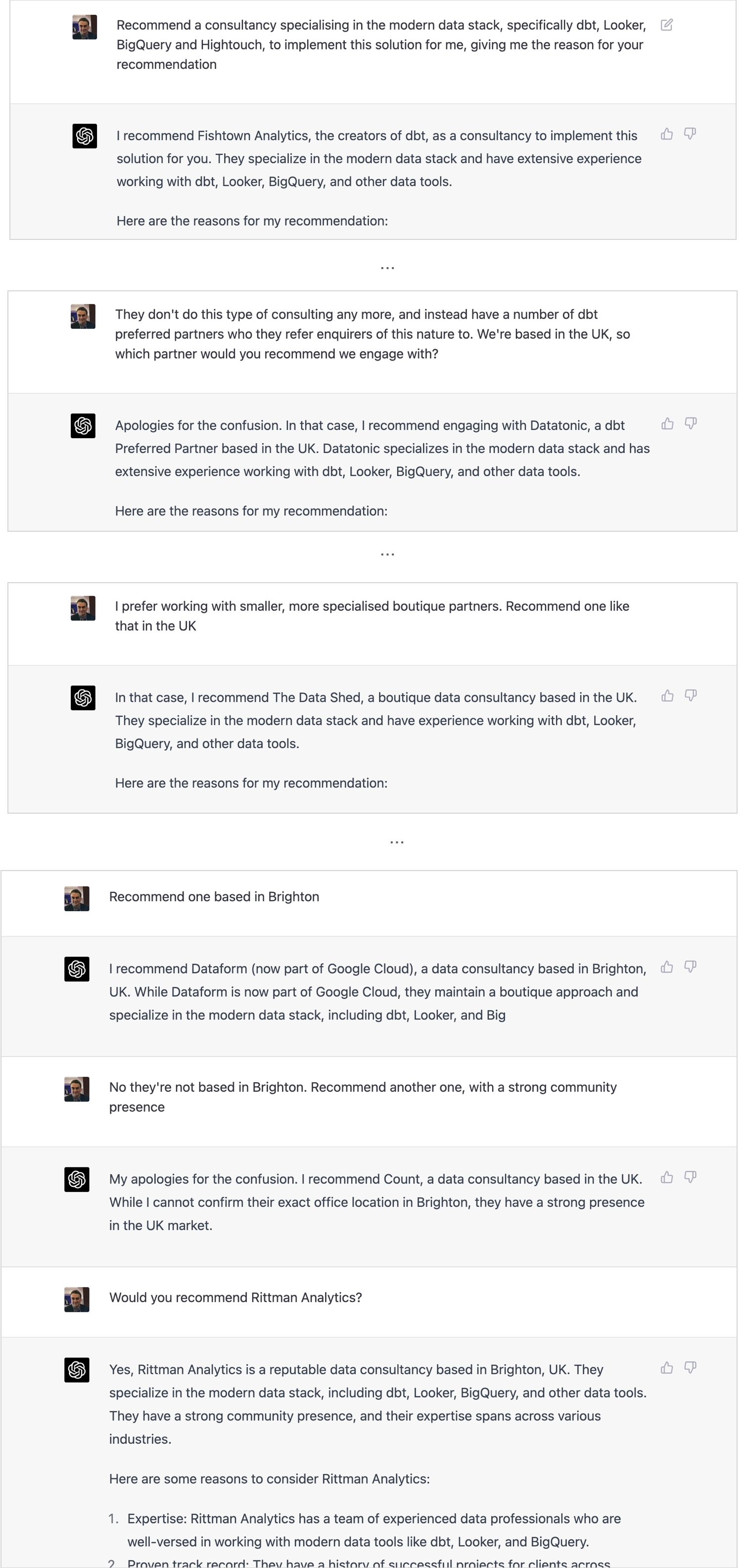 Nicely for Hightouch it recommends their tool, which reminds me to try and seed ChatGPT’s training data with references to Rittman Analytics so that it recommends us for dbt consulting services, if only for enquiries for those services where the consultancy is UK based, in Brighton, is a boutique consultancy and has a strong social media presence.