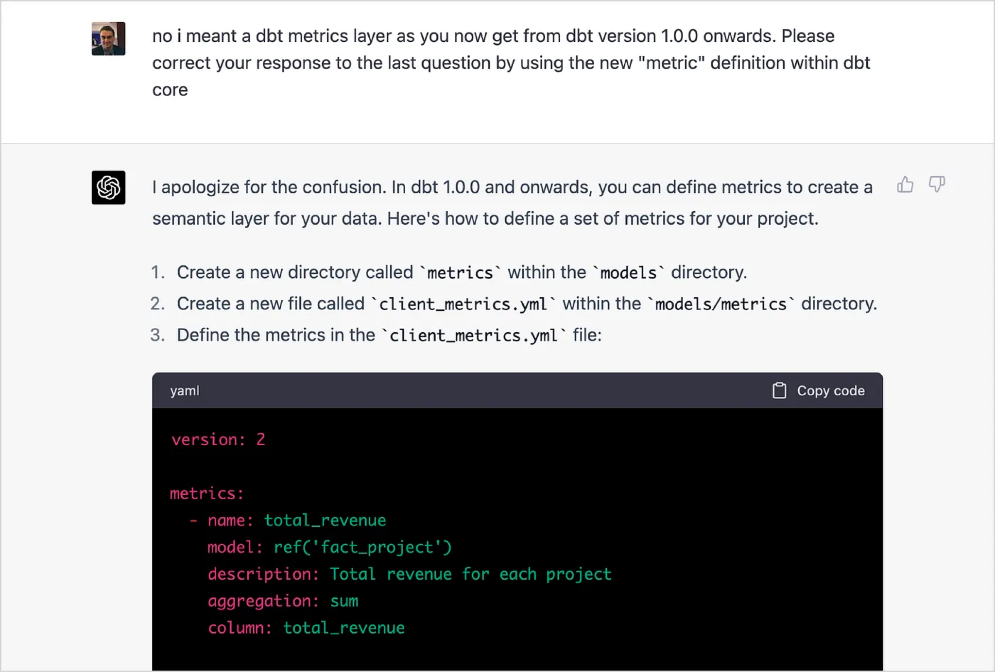 I then correct it and suggest a solution that uses the metrics feature introduced with more recent versions of dbt, to which ChatGPT responds first with an apology and then a revised solution that’s not a bad start to incorporating metrics and a semantic layer into the package.