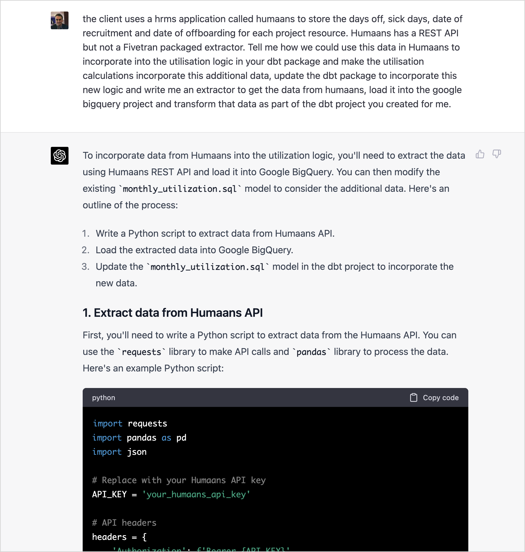 I even ask ChatGPT to bring-in data from our HRMS system, Humaans, suggesting that it uses that service’s REST API to create a data extractor for data that it then loads into our BigQuery database. It then provides an overview of its solution and generates the Python code to connect to Humaan’s REST API, download the relevant data and then load it into BigQuery using its Python client.