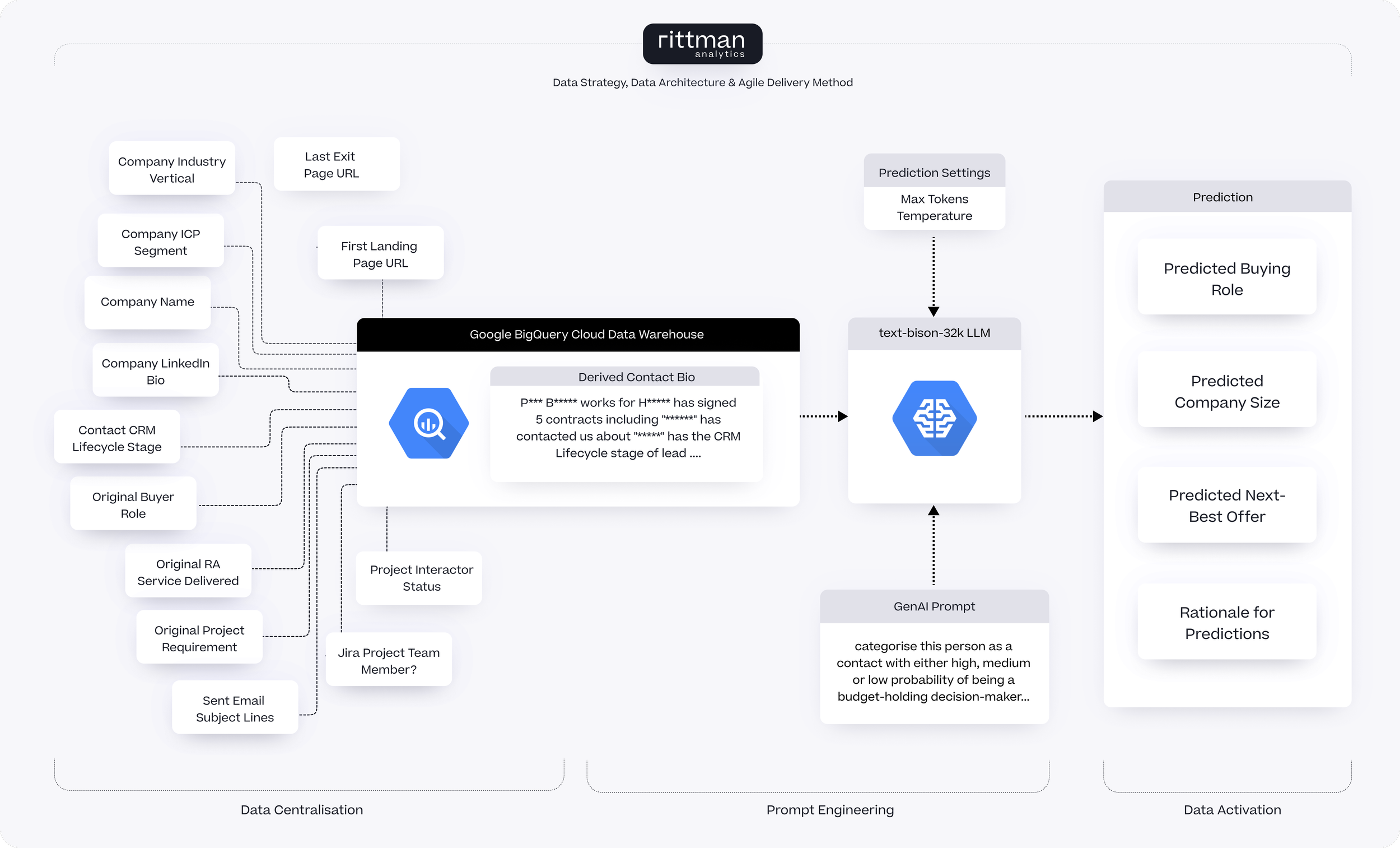 WITH contact_conversations AS ( SELECT conversation_from_contact_name AS contact_name, STRING_AGG(conversation_subject) AS contact_conversation_subjects FROM `ra-development.analytics.conversations_fact` s GROUP BY 1 ), contact_profile AS ( SELECT c.contact_pk, c.contact_name, -- Additional fields and complex COALESCE statements -- Truncated for brevity FROM `ra-development.analytics.contacts_dim` c LEFT JOIN `ra-development.analytics.contact_companies_fact` cc ON c.contact_pk = cc.contact_fk AND contact_next_created_date IS NULL LEFT JOIN contact_conversations s ON c.contact_name = s.contact_name LEFT JOIN `ra-development.analytics.companies_dim` d ON cc.company_fk = d.company_pk LEFT JOIN `ra-development.analytics.contracts_fact` f ON c.contact_pk = f.contact_fk ), contact_profiles_deduped AS ( SELECT contact_pk, contact_name, company_lifecycle_stage, contact_brief, company_name, ideal_customer_group FROM contact_profile GROUP BY 1,2,3,4,5,6 ), predictions as ( SELECT contact_pk, contact_name, contact_brief, company_name, ideal_customer_group, ml_generate_text_result['predictions'][0]['content'] AS predicted_decision_maker_type, ml_generate_text_status as prediction_status, FROM ML.GENERATE_TEXT( MODEL `analytics_ai.bison_model`, ( SELECT CONCAT('Classify this person as one of the following categories of probability of being a budget-holding decision maker in sales activity with us on behalf of their organisation,putting emphasis on their job title and whether they have signed statement of work or project delivery contracts before, (not employment, redundancy or related contracts) and with having no explicit job title reducing that probability, as either High,Medium or Low. Also predict their categories of consulting services interest from the list "Operational Reporting", "Marketing Analytics", "Data Centralization", "Product Analytics", "Marketing Attribution" or "Unknown", separating multiple categories if predicted for a contact using commas, and then predict the category of organization or company that the person works for from Startup, SMB, Mid-Market, Enterprise. Give me the rationale your categorisations ensuring any PII is obfuscated in that rationale and do not return any words or comments apart from these three sets of categorisations and rationale. Your response should be in the form of a single line of text that separates each categorisation for the person using a colon, for example: High:Marketing Analytics,Product Analytics:SMB:Signed statement of work contracts before and has contacted about operational reporting related topics. Text:',contact_name,'"',contact_brief,'"') AS prompt, * FROM contact_profiles_deduped order by length(contact_brief) desc limit 50 ), STRUCT( 0.0 AS temperature, 250 AS max_output_tokens)) ) select contact_pk, contact_name, contact_brief, split(string(predictions.predicted_decision_maker_type),':')[safe_offset(0)] as decision_maker_rating, split(string(predictions.predicted_decision_maker_type),':')[safe_offset(1)] as predicted_interest, split(string(predictions.predicted_decision_maker_type),':')[safe_offset(2)] as predicted_company_size, split(string(predictions.predicted_decision_maker_type),':')[safe_offset(3)] as rationale, coalesce(trim(prediction_status),'OK') as prediction_status from predictionsRunning this SQL query gave us predicted category segment values for (most of) the contacts within the scope of this query, with the split and safe_offset() string functions splitting out the various categorisation types from the LLM’s response, as you can see from the screenshot below.