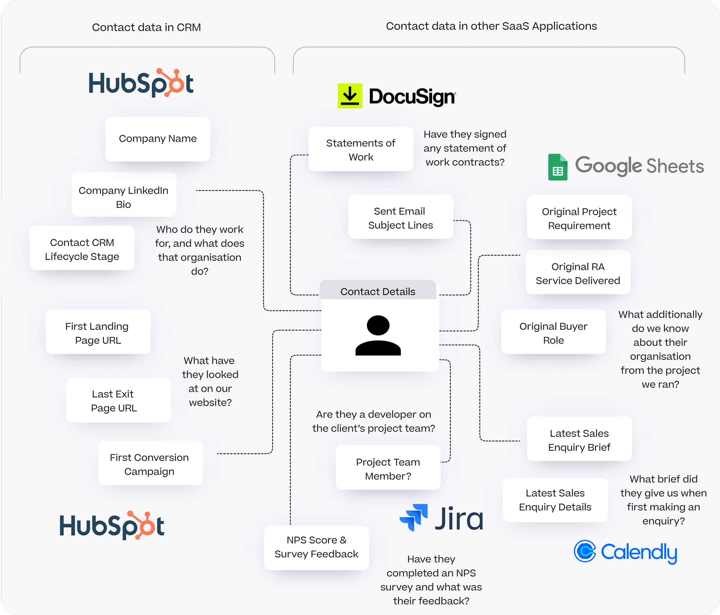 HubSpot, like most other CRM tools, captures and stores the basic details about a marketing contact such as their name, associated company and the campaign or website activity that introduced them to us, and enriches those basic details with public data such as their LinkedIn bio and Twitter handle.