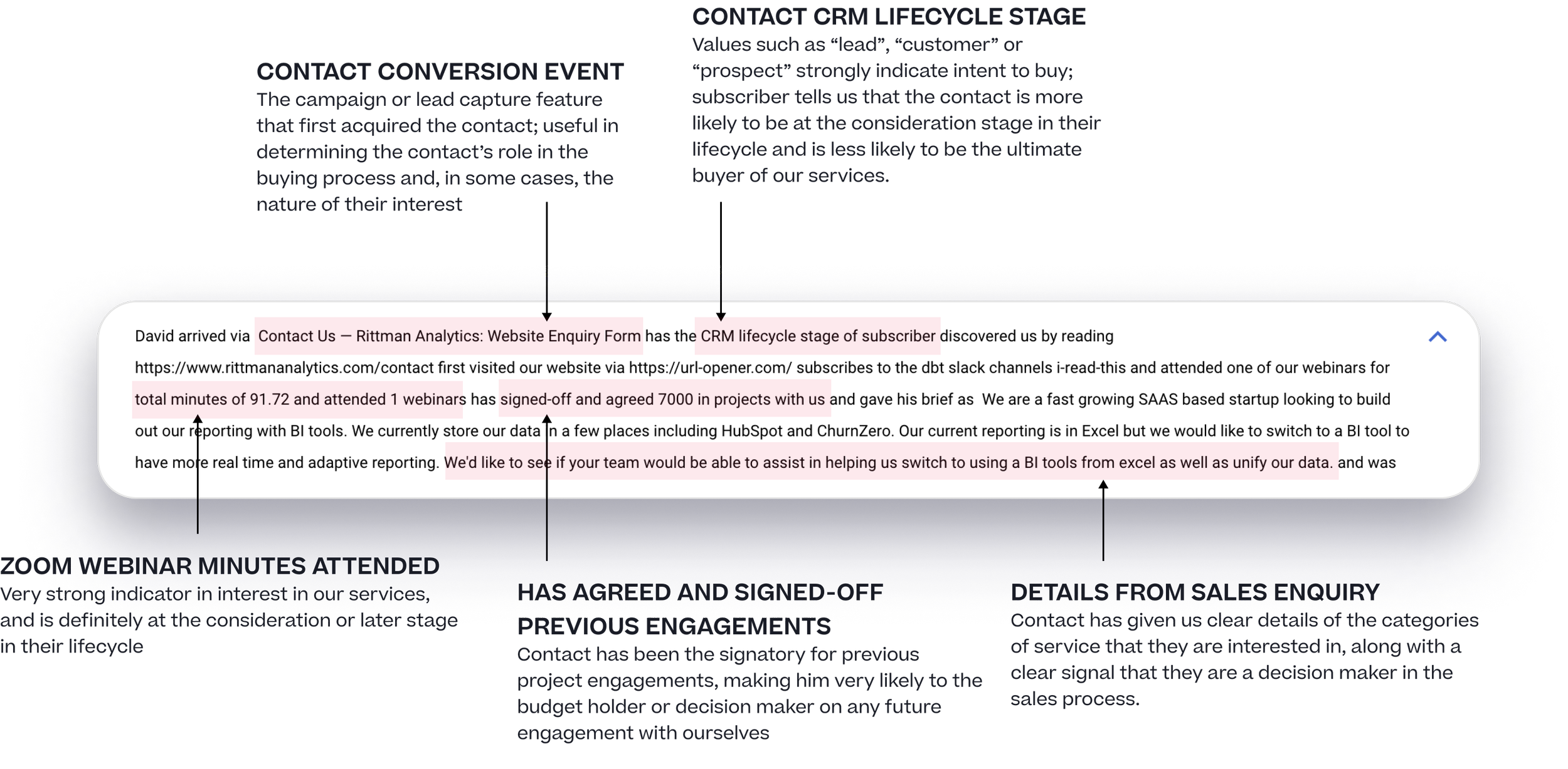 An example contact biography created by this SQL query is shown below, highlighting the elements of that particular biography that the LLM response is likely to consider in its categorisations: