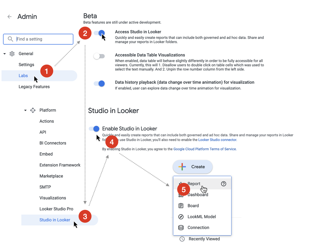 Studio in Looker isn’t by default turned on in Looker instances and depending on your hosting version and authentication method you’ll need to in some cases submit a request form and then turn-on the feature as per the screenshots below, and once it’s available to your users you’ll see a Report option in the menu that appears when you press the new Create button.