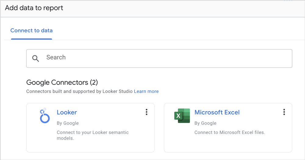 Only Looker and Microsoft Excel spreadsheets (note, not Google Sheets) as data source options