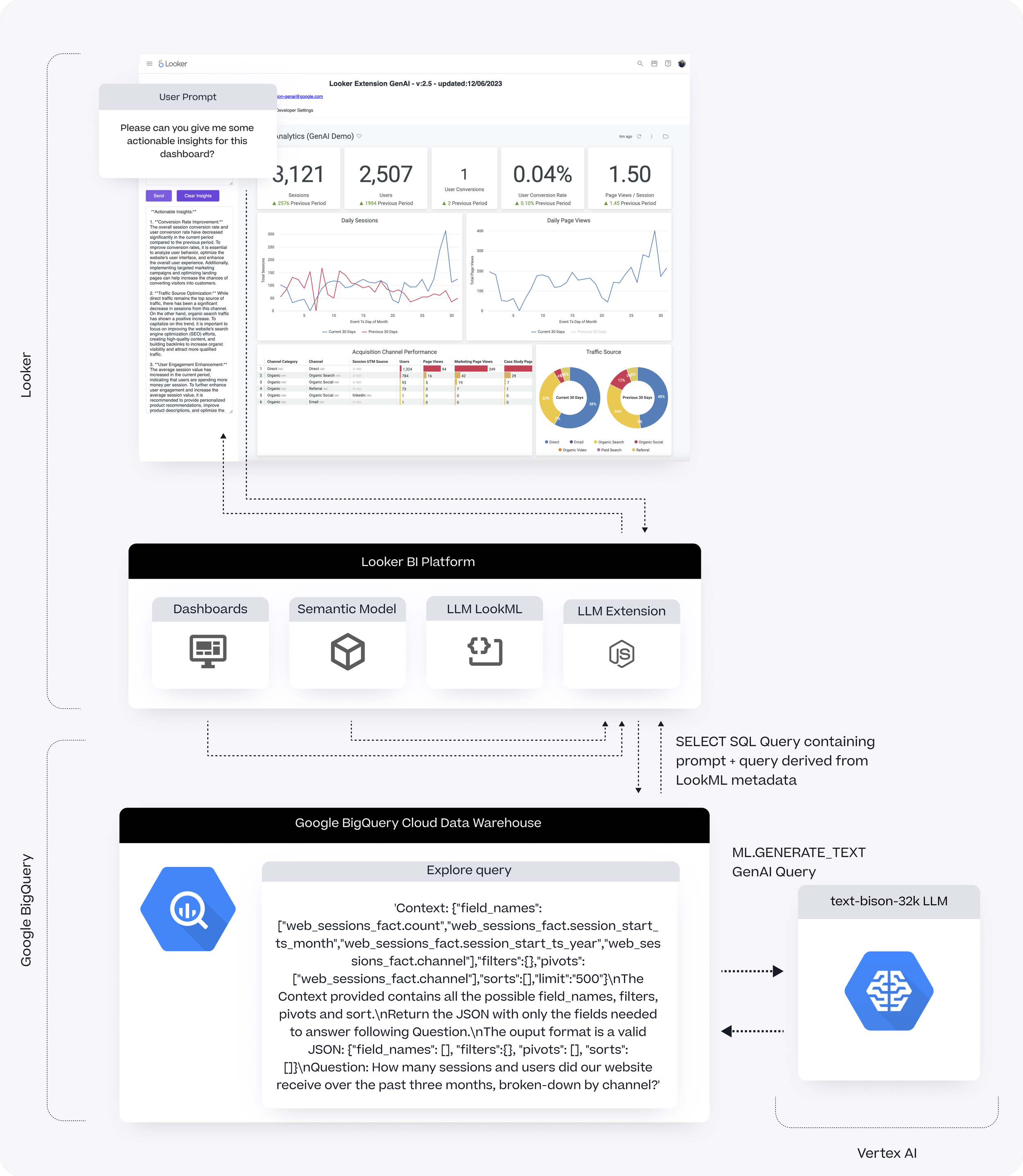 This time around we have Looker, through the GenAI extension application, constructing a prompt to send to Vertex AI through ML.GENERATE_TEXT by combining your natural language query with either the explore metadata for the first use-case or the contents of the dashboard page for the second, returning either a LookML query and some analysis or just some analysis, respectively.