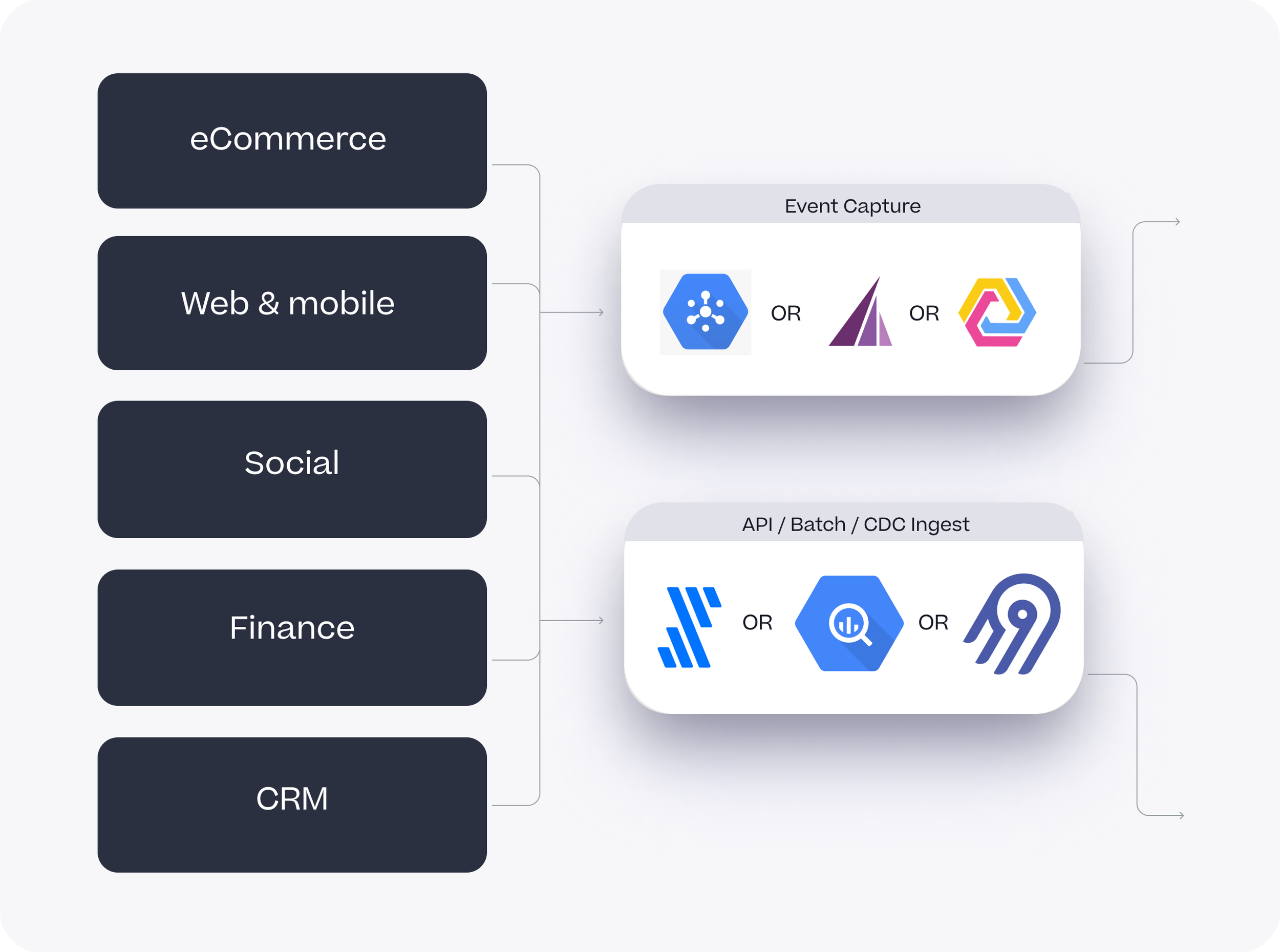 Data ingestion is a good example in that, whilst there are services such as Cloud Dataflow, PubSub and BigQuery Data Transfer Service that can automate the loading of data into your BigQuery warehouse, we typically recommend third-party services such as Fivetran and Airbyte as they’re more feature-complete than DTS and don’t require custom development as the other platform-native options do.